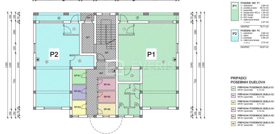 ▪ vjetrobran (2,66 m2), glavna prostorija (56,73 m2), dva toaleta (8,26 m2), spremište (4,05 m2), predprostor toaleta (1,44 m2), te natkrivena terasa neto površine 3,57 m2, ukupna neto površina poslovnog prostora: 76,71 m2.