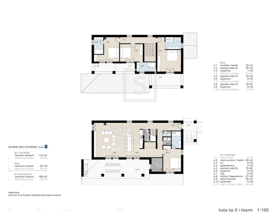Projekt predviđa izgradnju kuće ukupne bruto površine 277 m², od čega 199 m² čini zatvoreni stambeni prostor, raspoređen na dvije etaže. Uz kuću je predviđen i bazen, idealan za boravak na otvorenom i uživanje u mediteranskom načinu života.