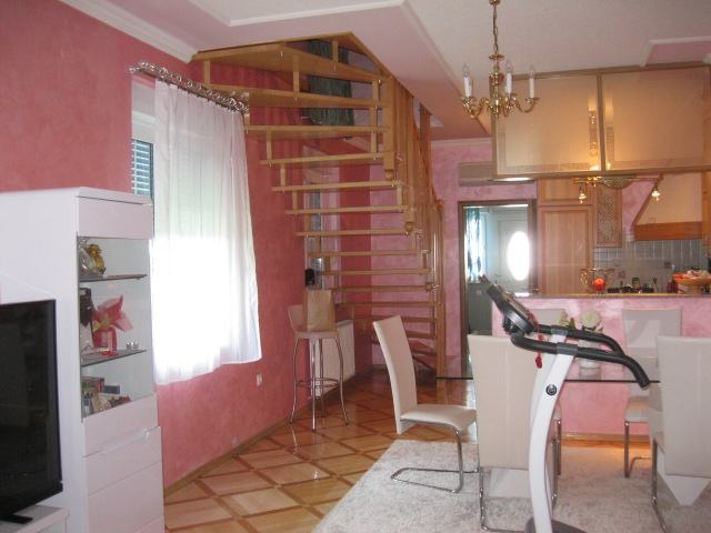 Prodajemo trosobnu kuću, dvodomku prizemnicu s potkrovljem koja se nalazi u mirnoj zoni stanovanja prigradskog mjesta Višnjevac - odlična lokacija blizine samog središta Višnjevac, OŠ, Dječjeg vrtića, Doma zdravlja, gradskog-tramvajskog prijevoza...Kuća se sastoji od podruma, prizemlja i potkrovlja, BGP:123,57 m2, izgrađena prije 1968. godine (podrum naknadno izveden i rekonstruirano potkrovlje). Prije 8 godina je temeljito i kvalitetno adaptirana (nove el. i vod. instalacije, nove podne i zidne obloge, nova PVC stolarija, demit fasada...). Sastoji se od manjeg podruma pod djelom kuće te prizemlja u kojem se nalazi predsoblje, kupaonica, prostrana dnevna soba s kuhinjom i blagovaonicom te stubišta koje vodi u potkrovlje kuće u kojem su smještene dvije sobe odvojene predsobljem i dvije terase (svaka soba ima izlaz na terasu). Kuća se prodaje kompletno namještena modernim i kvalitetnim namještajem koji je je u cijeni kuće. Površina parcele iznosi 241 m2 s izlazom na dvije ulice.