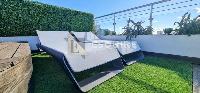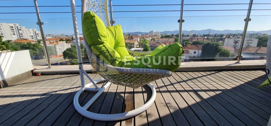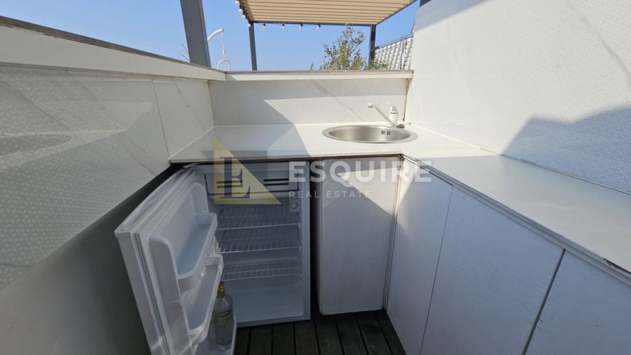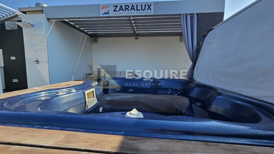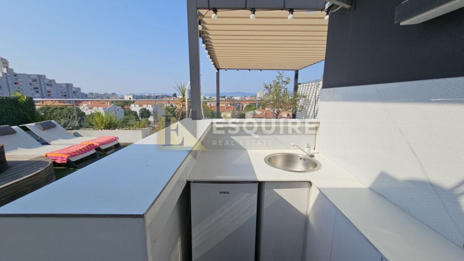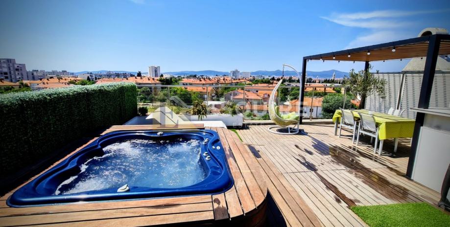 Iznad čitavog stana se prostire krovna terasa na kojoj je jacuzzi bazen za šest osoba, tuš, šank s hladnjakom, ležaljke za sunčanje, te stol za objedovanje.