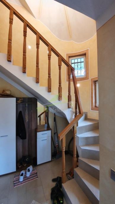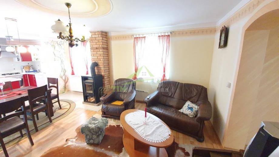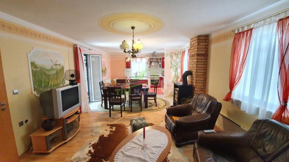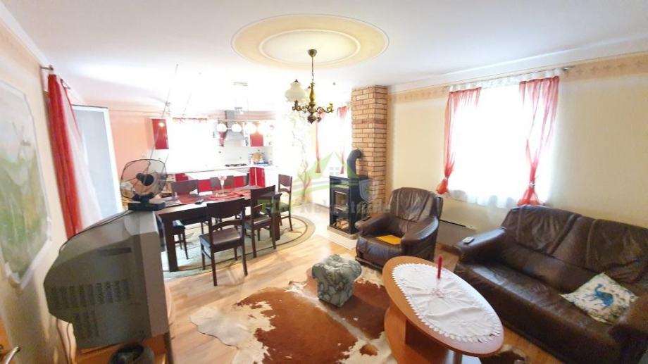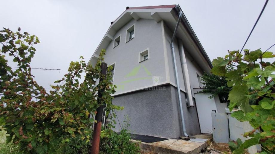 Kuća visoka prizemnica netto površine 144.01 m2, na zemljištu ukupne površine cca 4.000 m2.Sastoji se od podruma, prizemlja te potkrovlja; smještena na mirnoj i tihoj lokaciji sa prekrasnim panoramskim pogledom.Priključak struje (trofazni) i vode; mogućnost priključka telefona.Kombinirana stolarija (drvena i PVC); vanjska termofasada (10 cm); grijanje: centralno grijanje na kruta goriva te lož ulje; kamin u dnevnom boravku.U sobama laminat a ostalim prostorijama keramika.