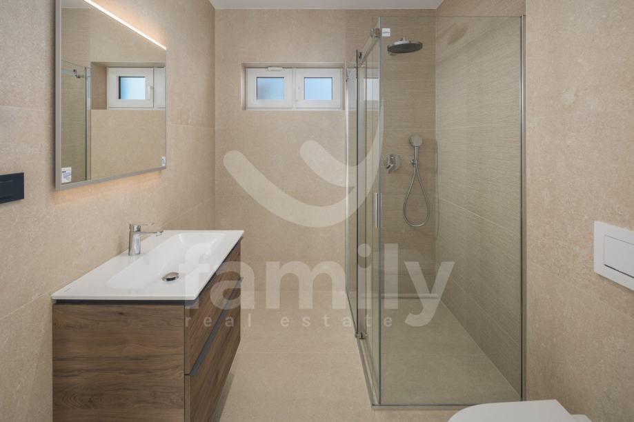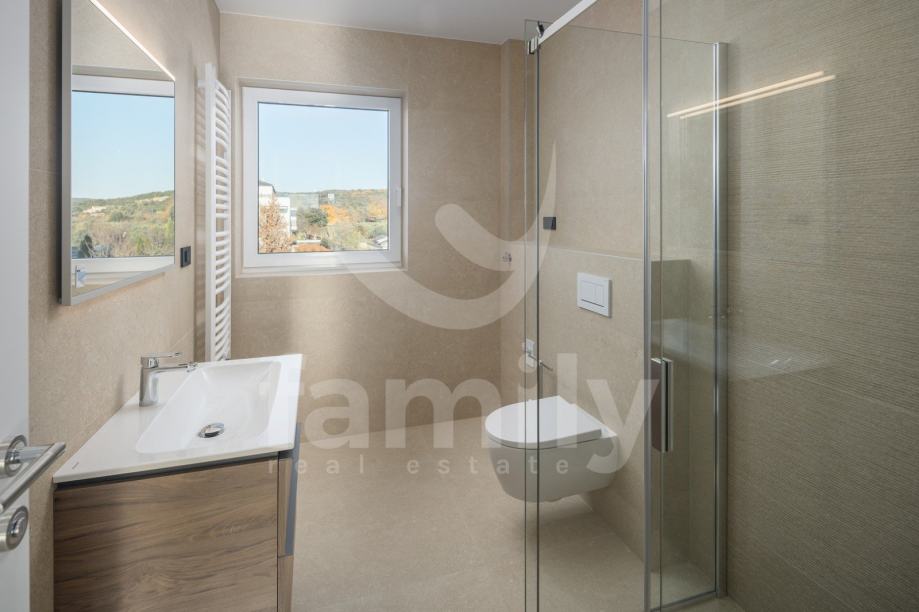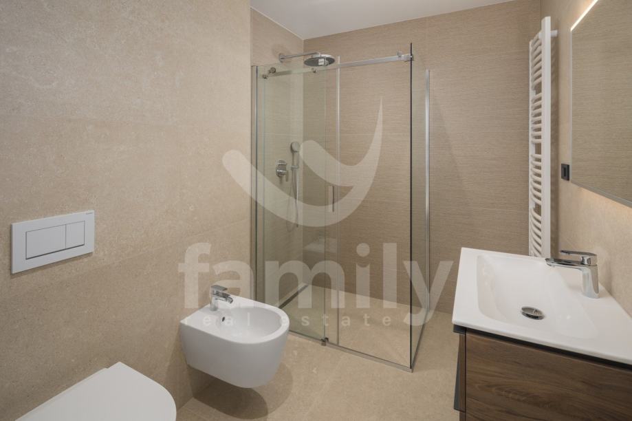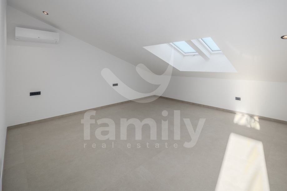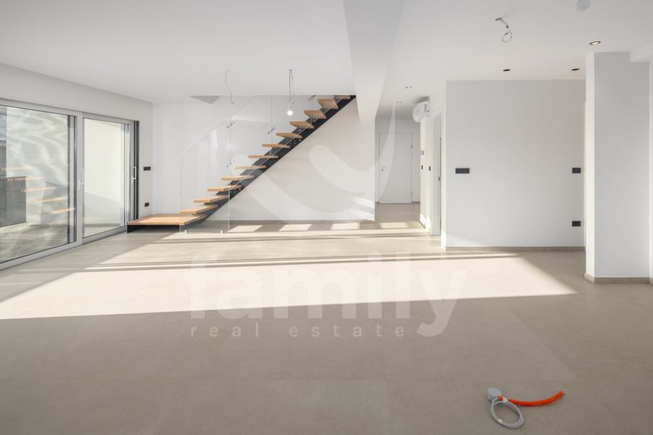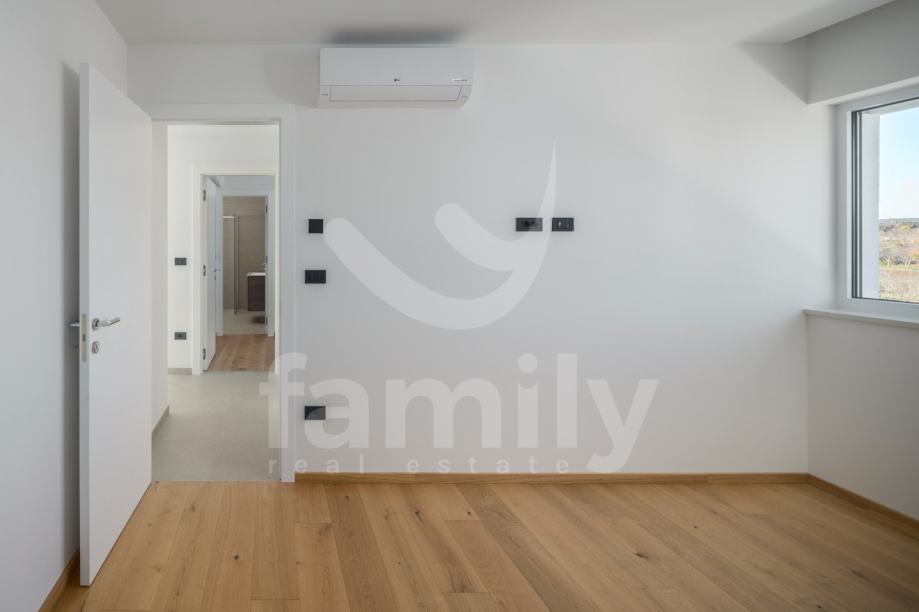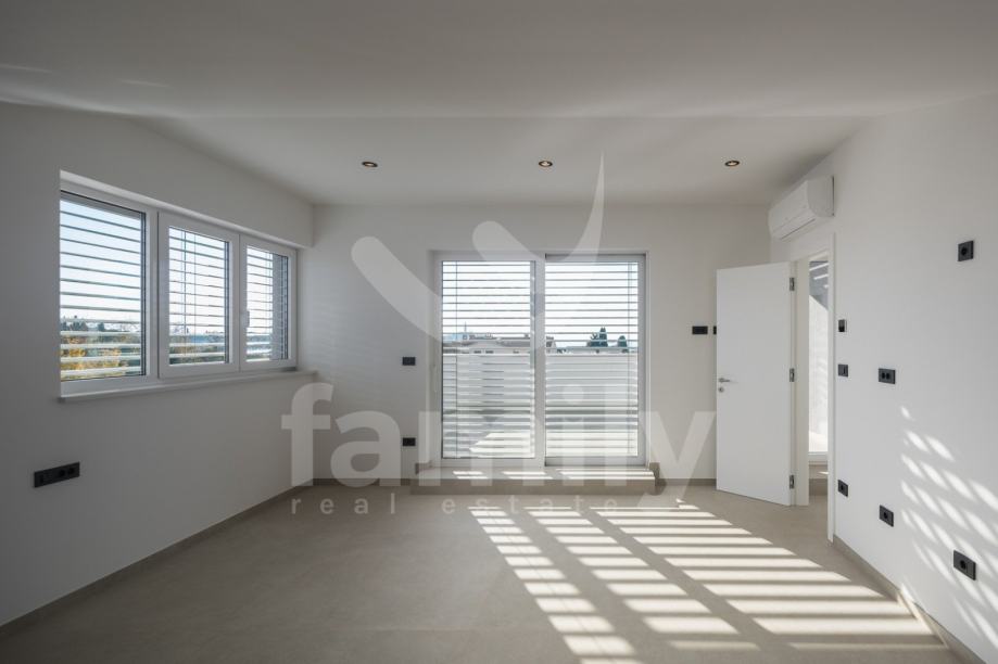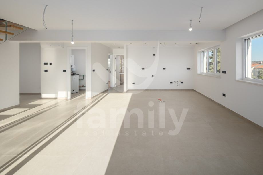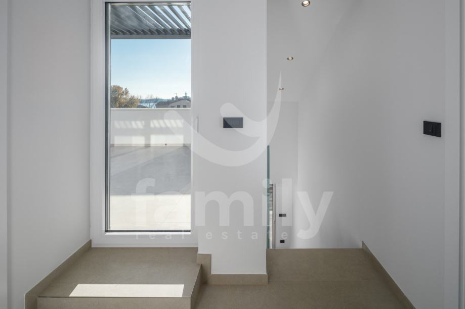 Upravo u Rovinju, u novoigrađenoj visokokvalitetnoj zgradi na odličnoj lokaciji nalazi se ovaj prostrani stan površine 171 m2. Stan se nalazi na prvome i posljednjem katu ove manje stambene zgrade i sastoji se od ulaznog predprostora, prostranog osvijetljenog dnevnog boravka sa kuhinjom i blagovaonicom, četiri spavaće sobe, tri kupaonice, ostave, prostranog balkona i prostrane terase sa koje se pruža pogled na more i Rovinj. Stan je opremljen visokokvalitetnom ALU stolarijom Schüco sa elektro roletama i komarnicima, protuprovalnim ulaznim vratima, podovi su obložene visokokvalitetnom keramikom i parketom, dok je sustav grijanja i hlađenja reguliran putem klima uređaja u svakoj prostoriji i postavljeno je podno grijanje na gradski plin. Zgrada je energetski učinkovita te je postavljena kamena vuna debljine 10 cm. Balkonska ograda je staklena, dok su kompletni unutarnji zidovi unutar stanova Knauf sistema. Pored luksuza nekretnine i same lokacije uz stan osigurana su i dva parkirna mjesta u garaži zgrade i ostava, a postojeći je lift od garaže do prvog kata što omogućuje lakše korištenje. Lokacija je izvrsna, mirna, a opet nedaleko od popratnog sadržaja i centra Rovinja te je blizu plaže na svega 200 metara. Zgrada posjeduje svu neophodnu dokumentaciju ukljućujući i uporabnu dozvolu.