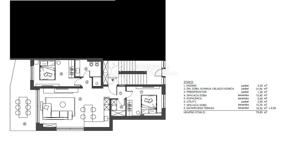 Najveća prednost ovog stana je prostrana terasa 18,50m2 (9.25m2 NETO)