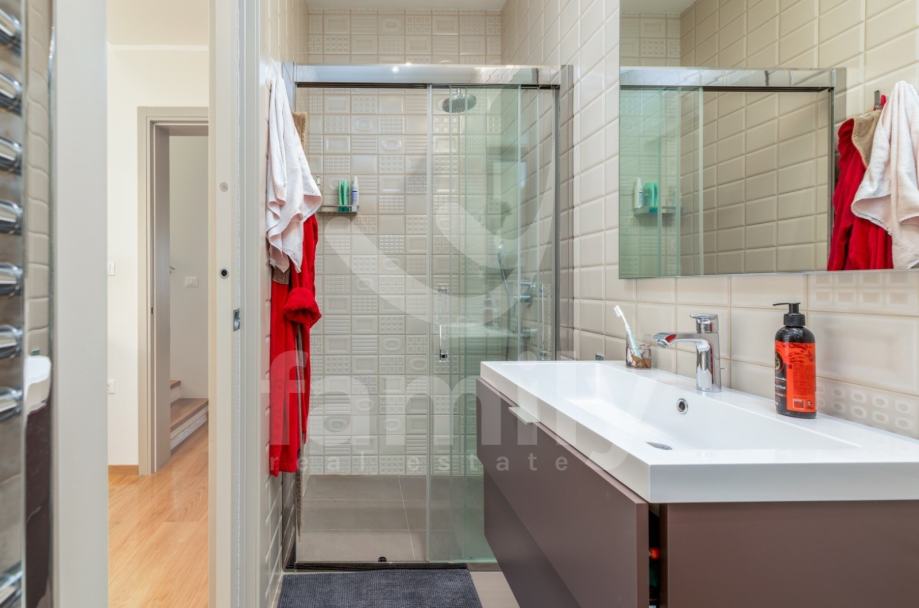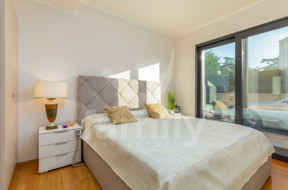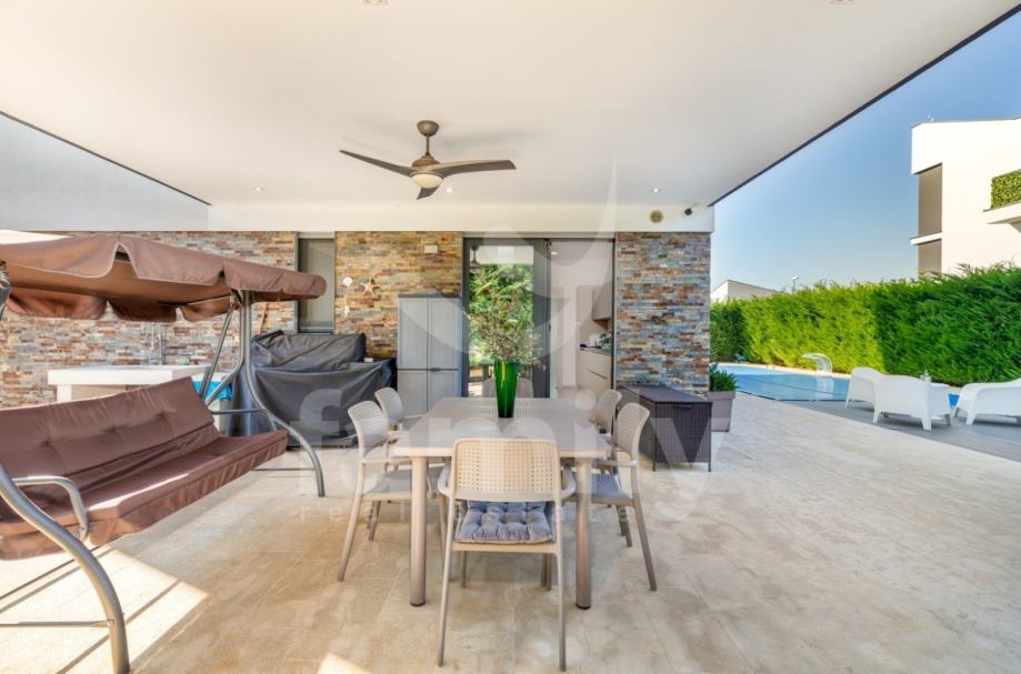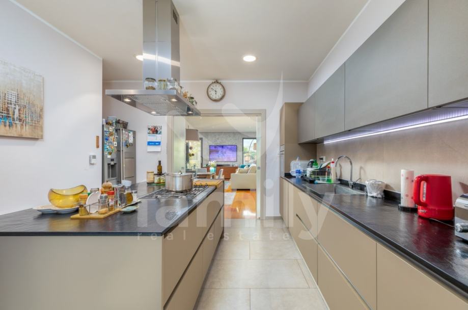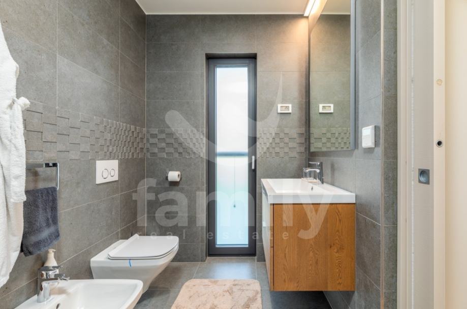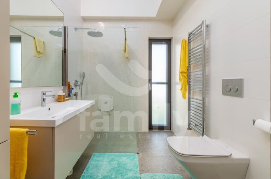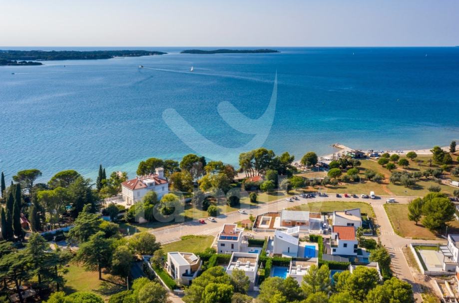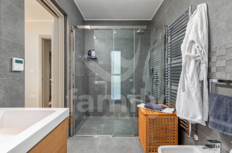 Upravo u Fažani na samo 100 m udaljenosti od mora se nalazi navedena moderna, komforna i visokokvalitetna vila sa stambenom površinom od 300 m2 te se ista proteže na tri etaže sa okućnicom od 460 m2. Prizemlje navedene impresivne nekretnine se sastoji od ulaznog predprostora opremljenim cipelarnikom i ugradbenim ormarima, veoma prostranog i osvijetljenog dnevnog boravka sa izlazom na terasu gdje je smješten bazen površine 40 m2 sa masažnim dijelom i slapom, sunčalište ispod kojeg se nalazi kotlovnica, jacuzzi, vanjski tuš kao i ljetna kuhinja sa stolom za ručavanje. Oko bazena je postavljen štokovani mramor što spriječava sklizanje. U prizemlju se također nalazi potpuno opremljena kuhinja sa otokom, jedna komforna spavaća soba sa vlastitim kupatilom kao i gostinjski toalet. Unutarnjim stepenicama ili pak liftom se prilazi drugoj etaži gdje su smještene četiri spavaće sobe od kojih dvije posjeduju prekrasan pogled na more te svaka spavaća soba posjeduje televizor kao i vlastitu kupaonicu sa walk-in tušem. U visokom potkrovlju navedene vile se nalazi soba koja se trenutno koristi kao spremište s tim da se ista može preurediti u dodatnu spavaću sobu. Iz visokog potkrovlja se također prilazi krovnoj terasi na kojoj se nalazi vanjski tuš kao i zapanjujući pogled na more. Vila također pruža suteren koji se sastoji od praktične kuhinje, dnevnog dijela, ostave, gostinjskog toaleta, kotlovnice i vešeraja. U cijelom objektu su podovi obloženi visokokvalitetnim parketom kao i keramikom, sprovedeno je podno grijanje, postavljena ALU stolarija te je u cijelom objektu ugrađen sustav centralnog usisavanja sa sprovedenim cijevima u svakoj prostoriji. Grijanje i hlađenje je uz podno grijanje regulirano putem ventilokonvektora koji su također ugrađeni u svakoj prostoriji. Dio fasade je obložen portugalskim kamenom debljine 2,5 cm koji u svako godišnje doba regulira temperaturu u samoj nekretnini. Nekretnina je također opremljena sustavom navodnjavanja kao i dizalicama topline te se ista prodaje potpuno namještena.