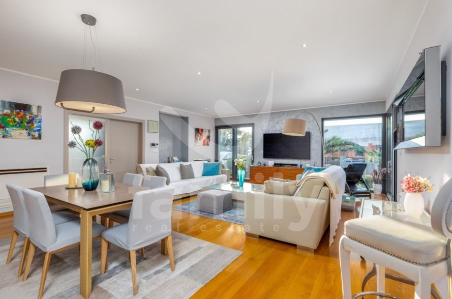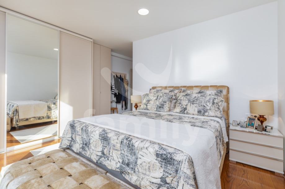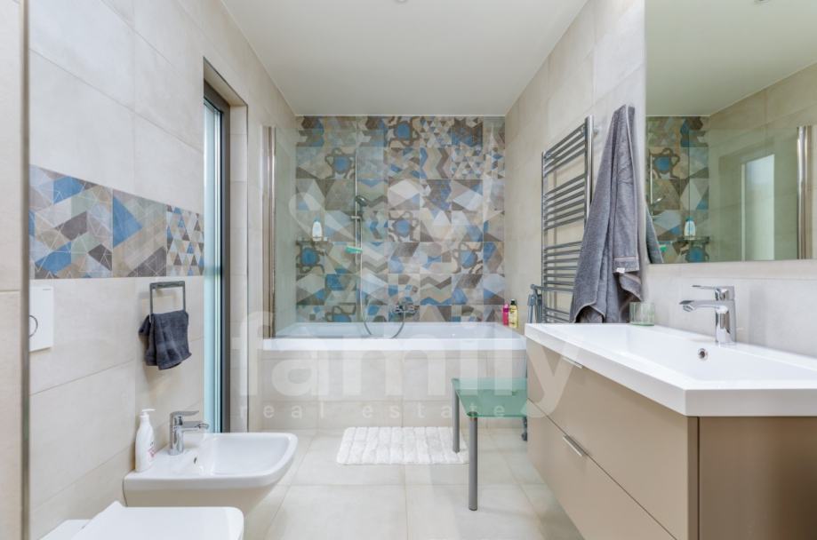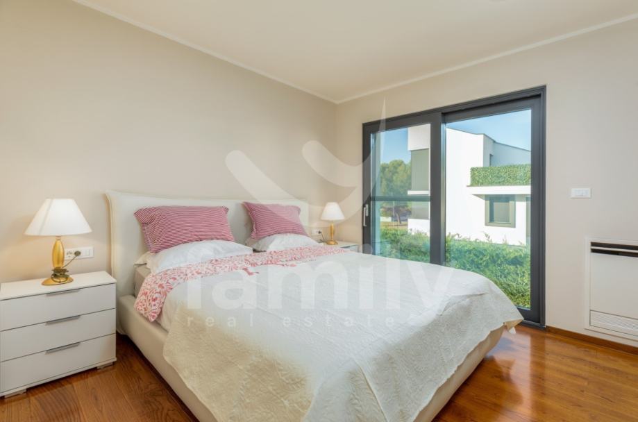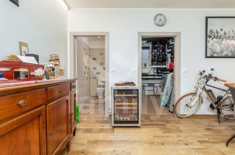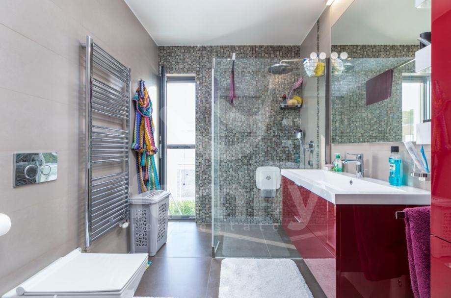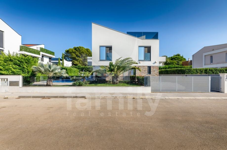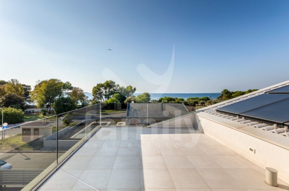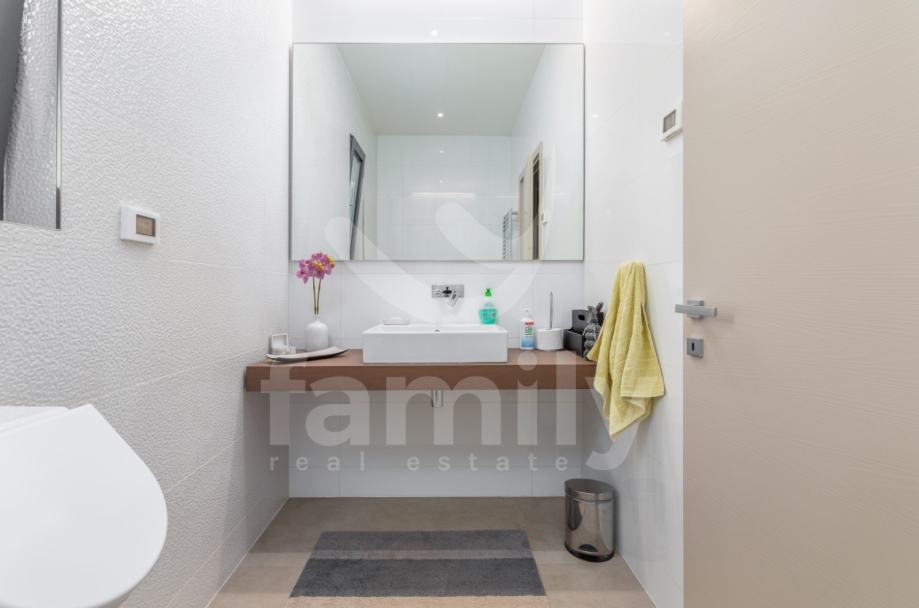 Upravo u Fažani na samo 100 m udaljenosti od mora se nalazi navedena moderna, komforna i visokokvalitetna vila sa stambenom površinom od 300 m2 te se ista proteže na tri etaže sa okućnicom od 460 m2. Prizemlje navedene impresivne nekretnine se sastoji od ulaznog predprostora opremljenim cipelarnikom i ugradbenim ormarima, veoma prostranog i osvijetljenog dnevnog boravka sa izlazom na terasu gdje je smješten bazen površine 40 m2 sa masažnim dijelom i slapom, sunčalište ispod kojeg se nalazi kotlovnica, jacuzzi, vanjski tuš kao i ljetna kuhinja sa stolom za ručavanje. Oko bazena je postavljen štokovani mramor što spriječava sklizanje. U prizemlju se također nalazi potpuno opremljena kuhinja sa otokom, jedna komforna spavaća soba sa vlastitim kupatilom kao i gostinjski toalet. Unutarnjim stepenicama ili pak liftom se prilazi drugoj etaži gdje su smještene četiri spavaće sobe od kojih dvije posjeduju prekrasan pogled na more te svaka spavaća soba posjeduje televizor kao i vlastitu kupaonicu sa walk-in tušem. U visokom potkrovlju navedene vile se nalazi soba koja se trenutno koristi kao spremište s tim da se ista može preurediti u dodatnu spavaću sobu. Iz visokog potkrovlja se također prilazi krovnoj terasi na kojoj se nalazi vanjski tuš kao i zapanjujući pogled na more. Vila također pruža suteren koji se sastoji od praktične kuhinje, dnevnog dijela, ostave, gostinjskog toaleta, kotlovnice i vešeraja. U cijelom objektu su podovi obloženi visokokvalitetnim parketom kao i keramikom, sprovedeno je podno grijanje, postavljena ALU stolarija te je u cijelom objektu ugrađen sustav centralnog usisavanja sa sprovedenim cijevima u svakoj prostoriji. Grijanje i hlađenje je uz podno grijanje regulirano putem ventilokonvektora koji su također ugrađeni u svakoj prostoriji. Dio fasade je obložen portugalskim kamenom debljine 2,5 cm koji u svako godišnje doba regulira temperaturu u samoj nekretnini. Nekretnina je također opremljena sustavom navodnjavanja kao i dizalicama topline te se ista prodaje potpuno namještena.