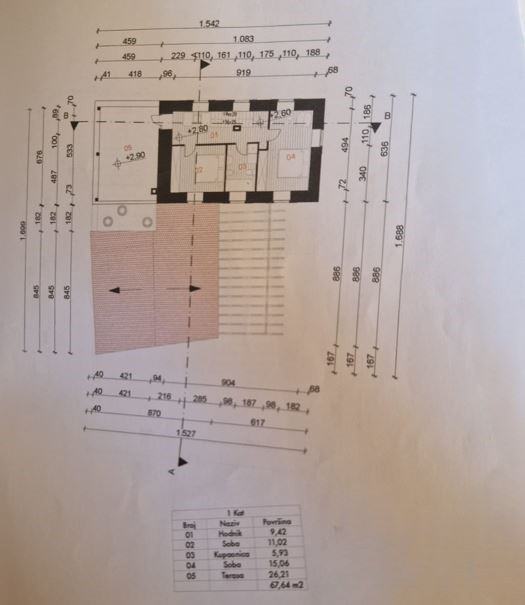 Na katu se nalazi hodnik, dvije spavaće sobe te kupaonica. Najveća vrijednost ove etaže je terasa podne površine 26,21 m2 koja otvara prostor prema van i omogućuje dodatnu privatnu zonu boravka.