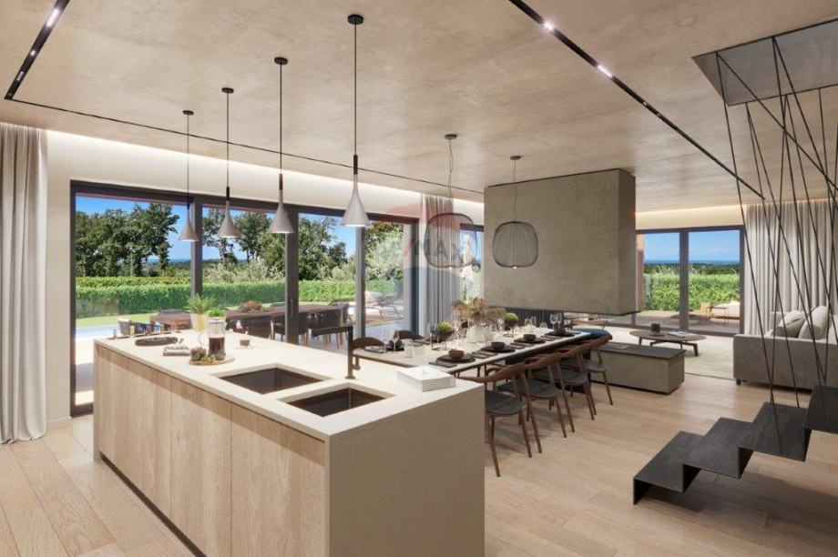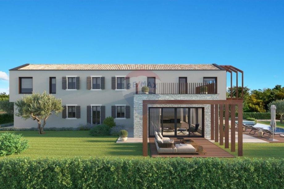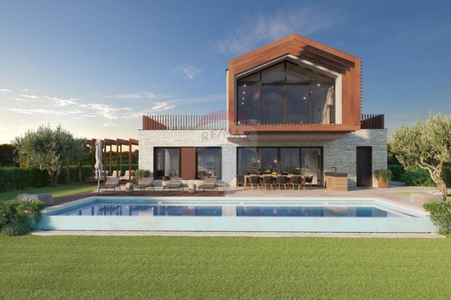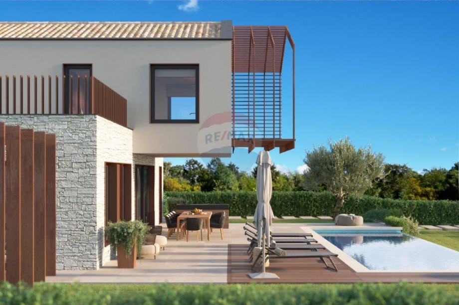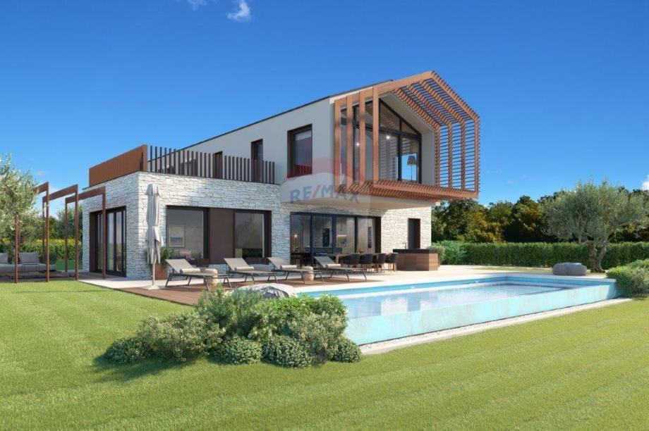 Na brežuljkastom terenu, vrlo otvorenog pogleda koji seže preko nepreglednih zelenih površina sve do mora i Alpi, niče ova moderna vila, vrlo zanimljive arhitekture. Smještena na parceli od 1005 m 2. Uživa potpunu privatnost, te plijeni pažnju svojim dominantnošću. Vila je veličine 260 m 2, u dvorištu predviđen je bazen od 50 m 2, sa pripadajućim sunčalištem. Pripada joj i garaža za 2 vozila, te vrtna kućica za uživanje u druženjima za toplijih dana. Sastoji se od prizemlja i kata, 4 spavaće sobe svaka sa svojom kupaonicom, podno grijanje, vrlo otvoreni i osunčani prostori, potpuna privatnost...