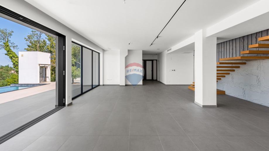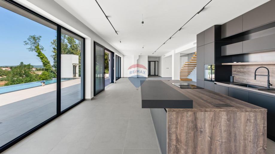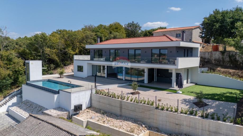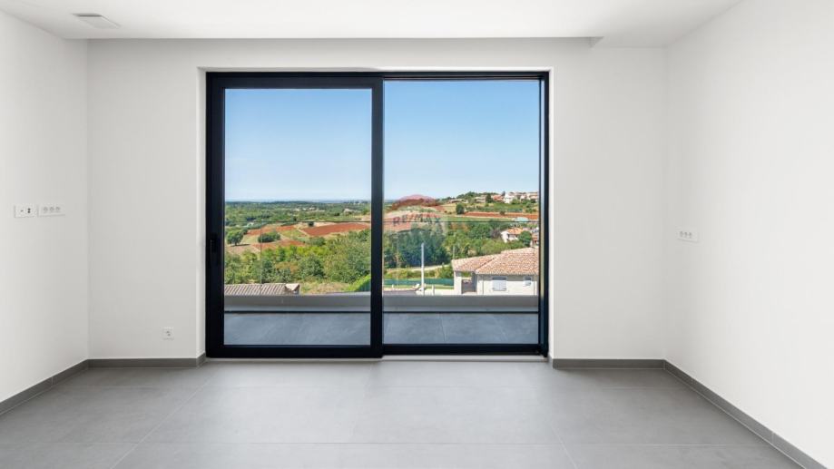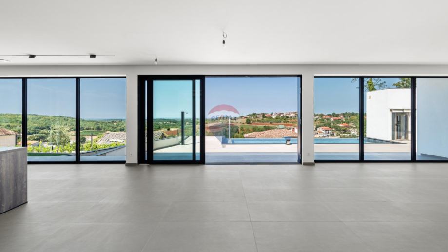 RE/MAX Centar nekretnina iz svoje ponude izdvaja ekskluzivnu modernu vilu smještena u mirnom i slikovitom mjestu u okolici Vižinada, na uzvišenom brežuljku s kojeg se pruža spektakularan panoramski pogled prema moru, vinogradima i maslinicima, sve do talijanske obale i Alpa.