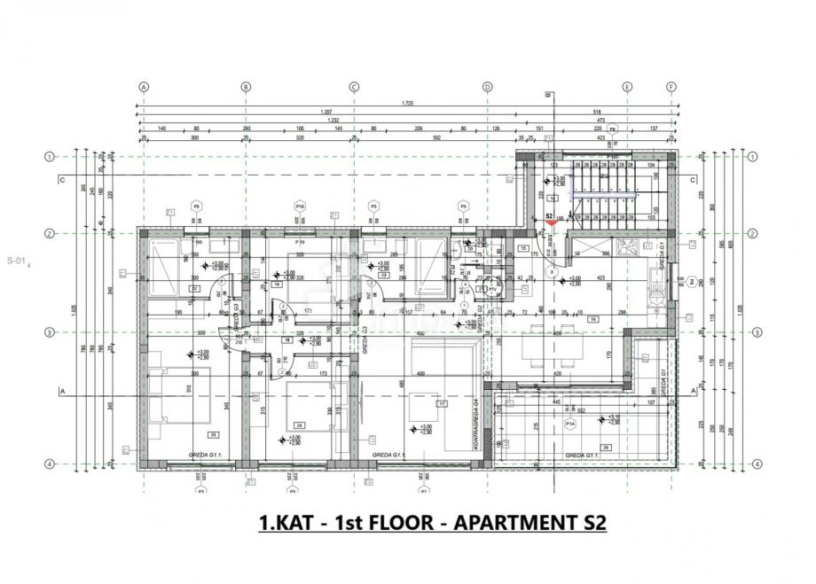 U Vodicama, s neometanim pogledom na Plavu plažu, 2. red do mora – novogradnja, manja luksuzna stambena zgrada s tri identična, trosobna, komforna apartmana. Apartman S2 nalazi se na 1.katu i ima korisnu površinu od 101,78 m². Zauzima cijeli 1.kat te se sastoji od ulaza, kuhinje s blagovaonicom i dnevnim boravkom, praonice, gostinjskog WC-a, kupaonice i tri spavaće sobe. Apartmanu pripada velika, natkrivena terasa površine 13,70 m². Apartman ima vlastito parkirno mjesto.