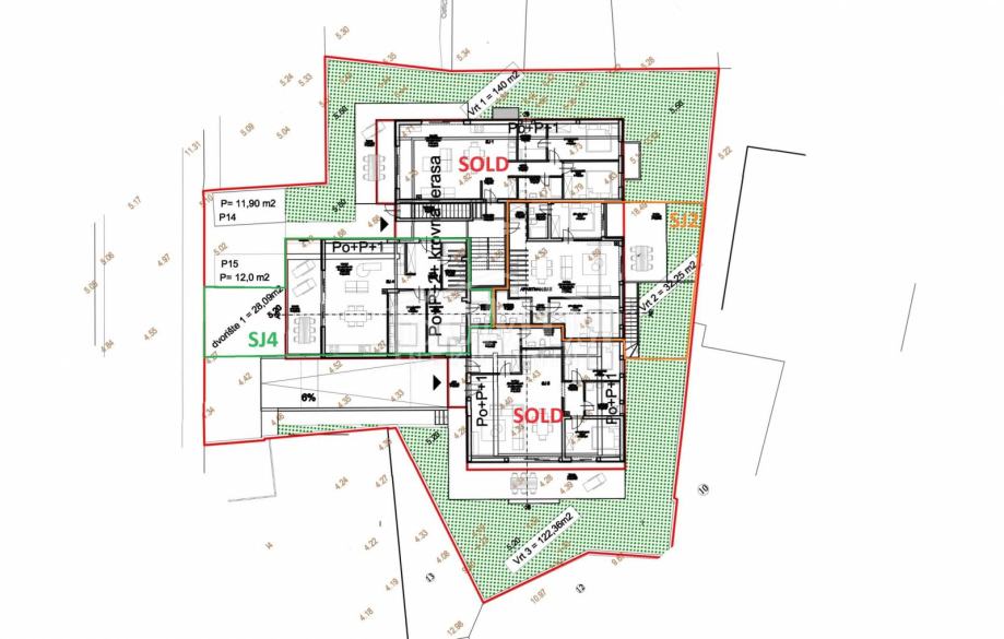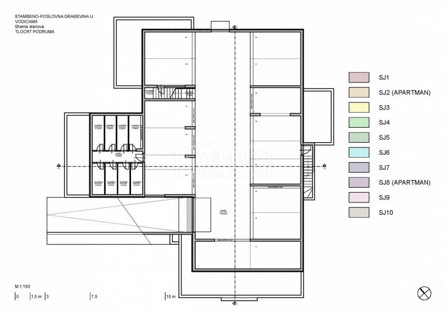 Zgrada se proteže kroz 5 etaža: podrum, prizemlje, I. kat, II. kat te III. kat / krovna terasa. U podrumskoj etaži su smještena spremišta i garažno parkirno mjesta za svaki stan.