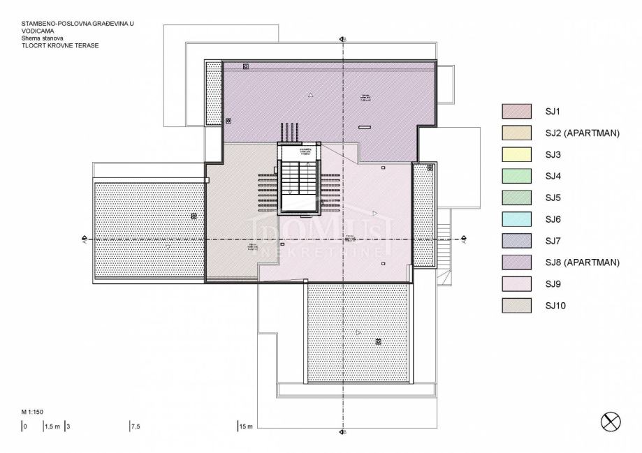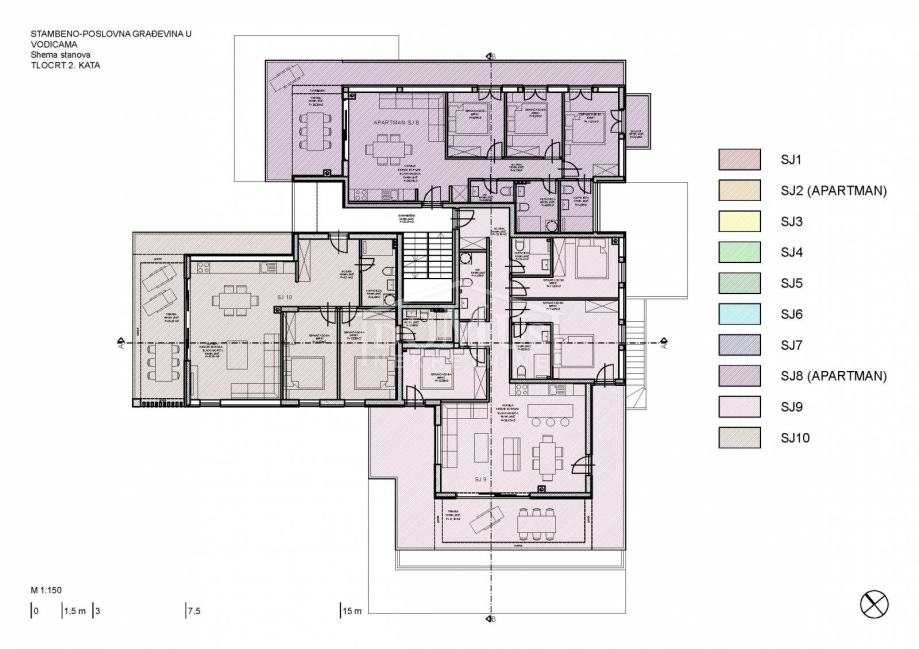 STAMBENA JEDINICA SJ8, smještena na II. katu zgrade, orijentirana na istočnu stranu, ima korisnu površinu od 104,36m2. Sastoji se od kuhinje, blagovaonice i dnevnog boravaka s izlazom na terasu površine 35,39m2, tri spavaće sobe od kojih jedna spavaća soba ima vlastiti kupaonicu i balkon, hodnik, kupaonica, gostinjski WC. Stambenoj jedinici pripada i krovnu terasa koja se prostire na 85,41m2, pružajući dodatni prostor za opuštanje i uživanje u otvorenom.