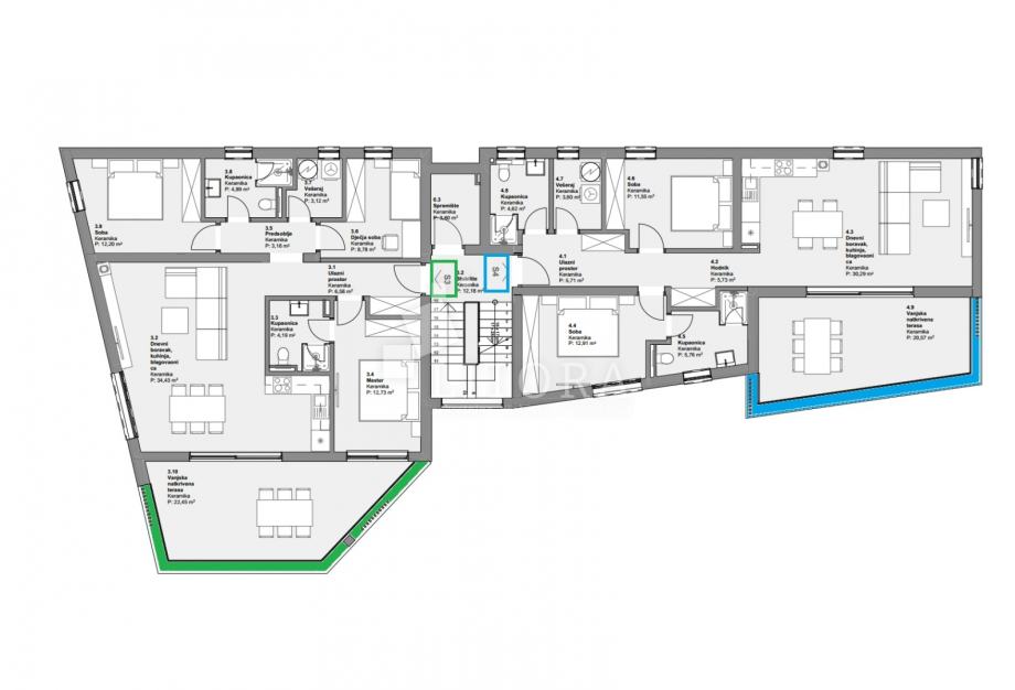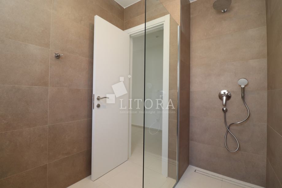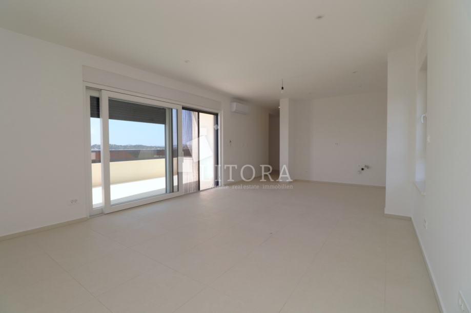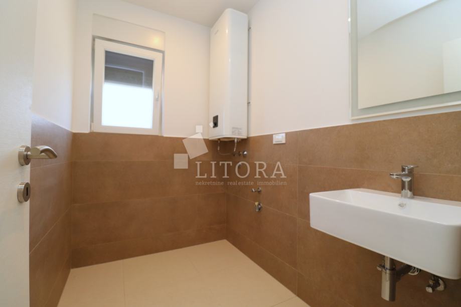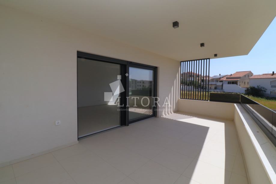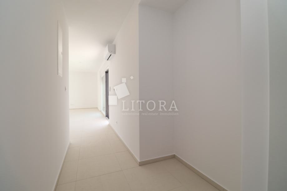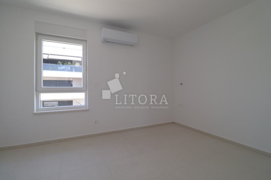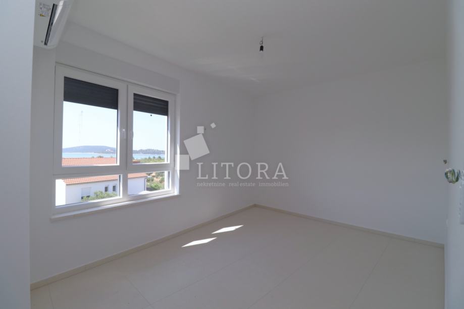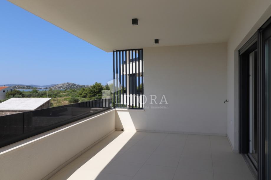 Vodice – novogradnja, 2-soban apartman ukupne korisne površine 90,69 m2, smješten na 1.katu stambene zgrade. Orijentiran je na južnu stranu a sastoji se od hodnika, 2 spavaće sobe (od kojih jedna soba ima vlastitu kupaonicu), kupaonice, vešeraja, dnevnog boravka s blagovaonicom i kuhinjom, s izlazom na natkrivenu terasu površine 20,57 m² sa pogledom na more. Odmah useljiv, opremljen je protuprovalnim vratima, klima-uređajima u svakoj prostoriji, električnim podizačima roleta, komarnicima, podnim grijanjem u kupaonicama i dnevnom boravku.