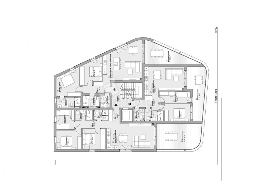 Vodice, novogradnja 2-sobni apartman s velikom terasom samo 150 m do plaže. Apartman ima 97,57 m2 podne površine, od čega zatvoreni stambeni prostor iznosi 79,03 m2, smješten je u na 1. katu u sklopu višestambene zgrade. Orijentiran na jugo-istočnu stranu sastoji se od predsoblja, vešeraja, 2 kupaonice, dvije spavaće sobe, dnevnog boravka s blagovaonicom i kuhinjom, s izlazom na natkrivenu terasu 18,52 m2. Apartman je opremljen protuprovalnim vratima, klima uređajima u svakoj prostoriji, električnim podizačima roleta, komarnicima, podno grijanje u kupaonici i dnevnom boravku, lift. Pripada mu jedno vanjsko parkirno mjesto. Udaljen 150 m od plaže i 550 m od centra grada.