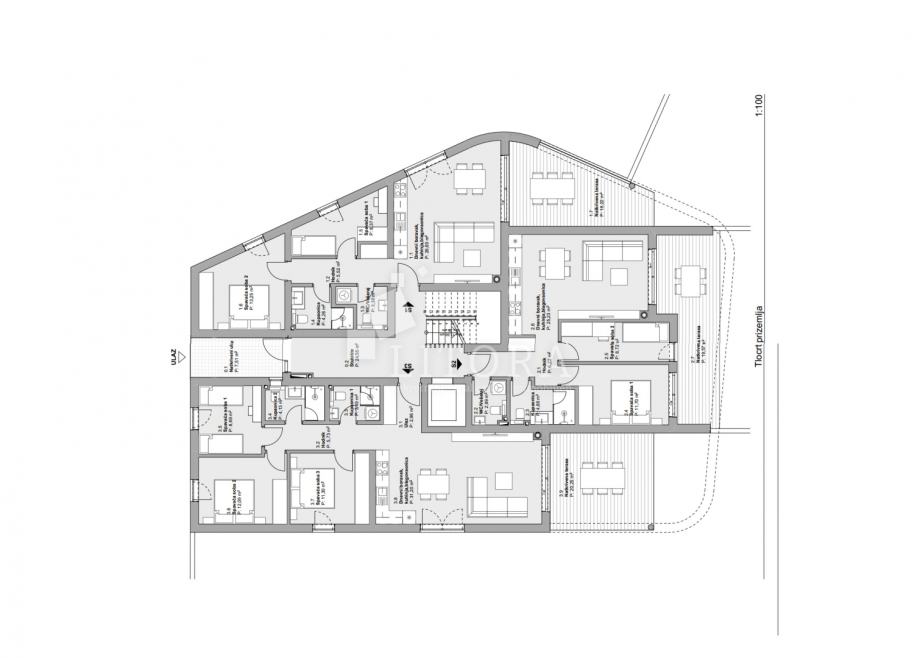 Vodice, novogradnja 2-sobni apartman s velikom terasom samo 150 m do plaže. Apartman ima 81,21 m2 podne površine, od čega zatvoreni stambeni prostor iznosi 59,74 m2, smješten je u prizemlju u sklopu višestambene zgrade. Orijentiran na južnu stranu sastoji se od predsoblja, wc-a, kupaonice, dvije spavaće sobe, dnevnog boravka s blagovaonicom i kuhinjom, s izlazom na natkrivenu terasu 21,47m2. Apartman je opremljen protuprovalnim vratima, klima uređajima u svakoj prostoriji, električnim podizačima roleta, komarnicima, podno grijanje u kupaonici i dnevnom boravku, lift. Pripada mu jedno vanjsko parkirno mjesto. Udaljen 150 m od plaže i 550 m od centra grada.