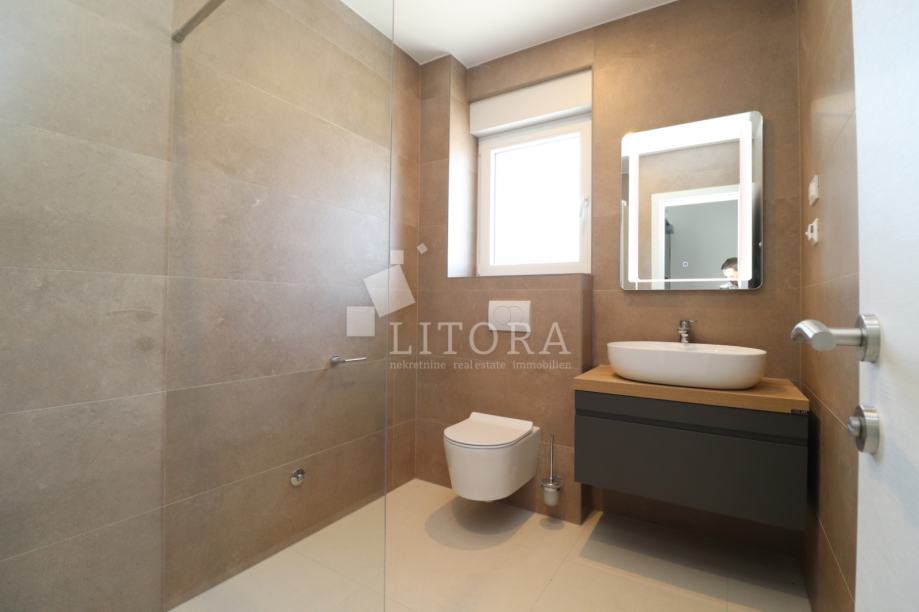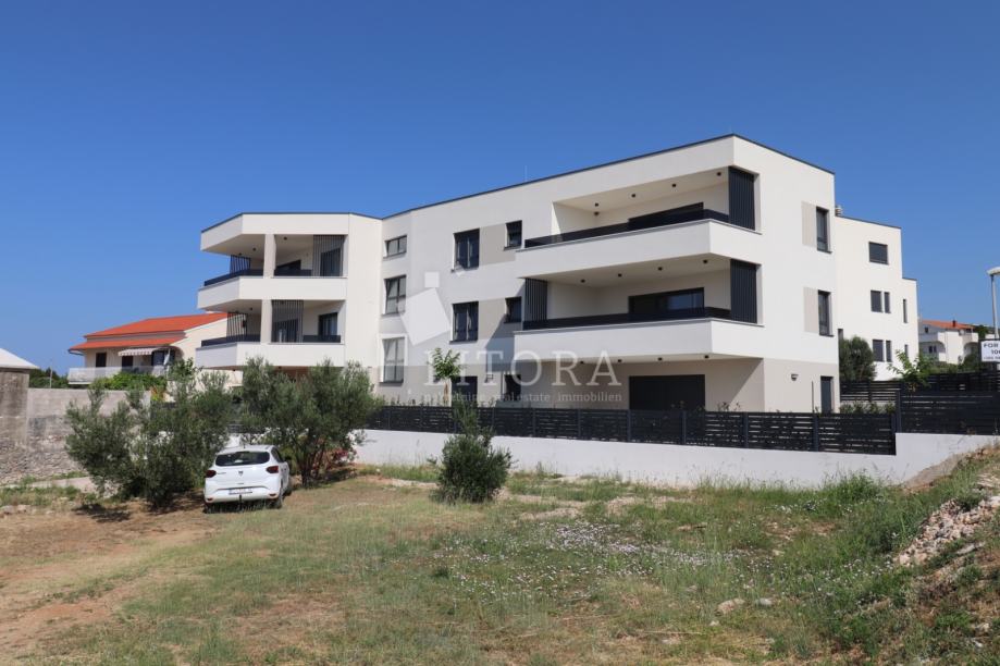 Vodice – novogradnja, 2-soban apartman ukupne korisne površine 90,62 m2, smješten na 2.katu stambene zgrade. Orijentiran je na južnu stranu a sastoji se od hodnika, 2 spavaće sobe (od kojih jedna soba ima vlastitu kupaonicu), kupaonice, vešeraja, dnevnog boravka s blagovaonicom i kuhinjom, s izlazom na natkrivenu terasu površine 20,57 m² sa pogledom na more. Odmah useljiv, opremljen je protuprovalnim vratima, klima-uređajima u svakoj prostoriji, električnim podizačima roleta, komarnicima, podnim grijanjem u kupaonicama i dnevnom boravku.