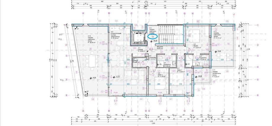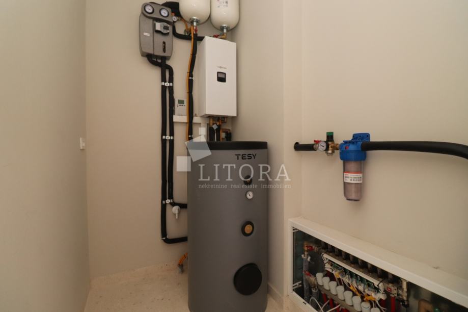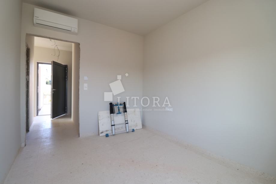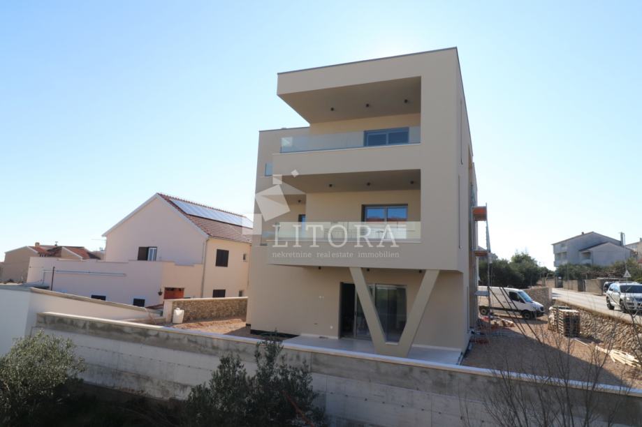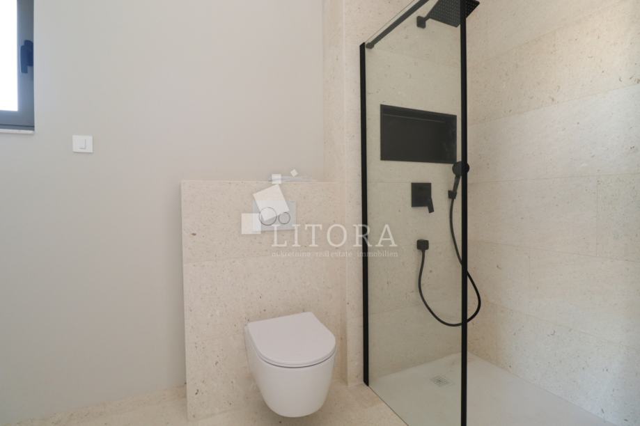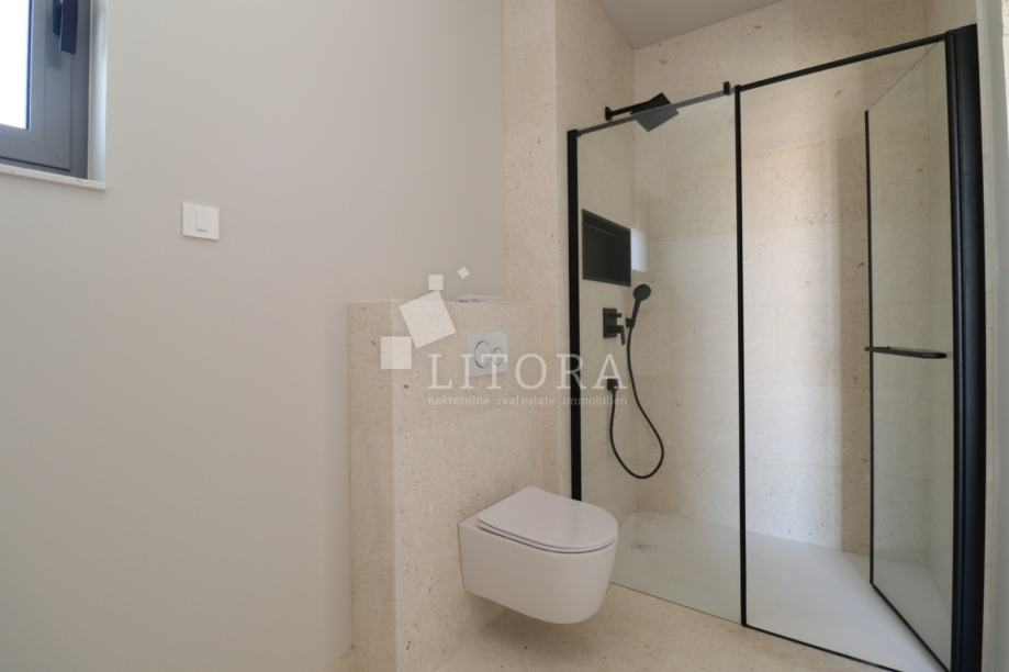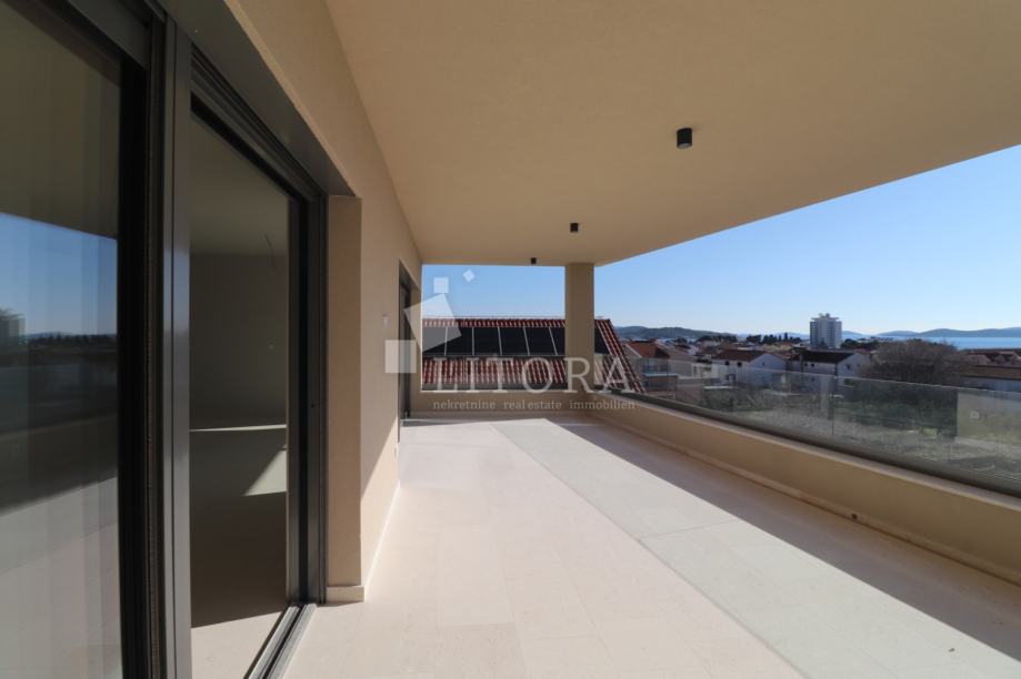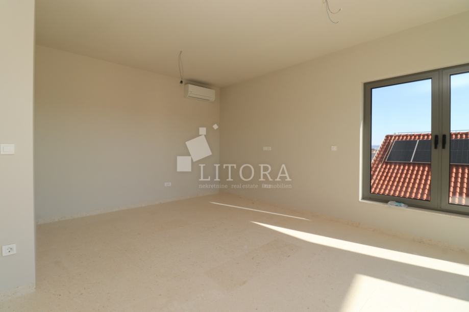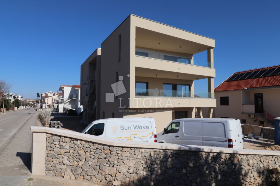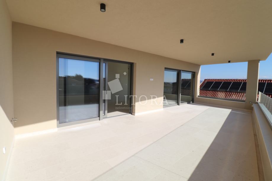 Vodice, penthouse novogradnja – 3-sobni apartman sa pogledom na more. Stambena jedinica S4 nalazi se na 2. katu zgrade, orijentirana je na južnu stranu, ima 130m² korisne površine. Sastoji se od predsoblja, praonice, dvije kupaonice, tri spavaće sobe ( od kojih jedna sa vlastitom kupaonicom i terasom površine17,17 m2) te open space kuhinje s blagovaonicom i dnevnim boravkom, s izlazom na prostranu natkrivenu terasu od 38,44m² sa pogledom na more. Zgrada ima ukupno tri etaže: prizemlje + 1. kat + 2. kat. Modernog je izgleda i bit će opremljena visokokvalitetnim podnim oblogama, unutarnjom i vanjskom stolarijom, klima uređajima za grijanje i hlađenje u svakoj prostoriji, električnim podizačima roleta, podno grijanje u cijelom stanu na vodu, solarne panele i spremnik za toplu vodu od 250 l i lift. Apartmanu pripadaju 2 parkirna mjesta. Zgrada se nalazi 600 m od Plave plaže, a 750 m od centra i svih važnijih sadržaja. Predviđeni termin useljenja je ljeto 2026 godine.