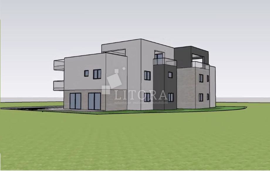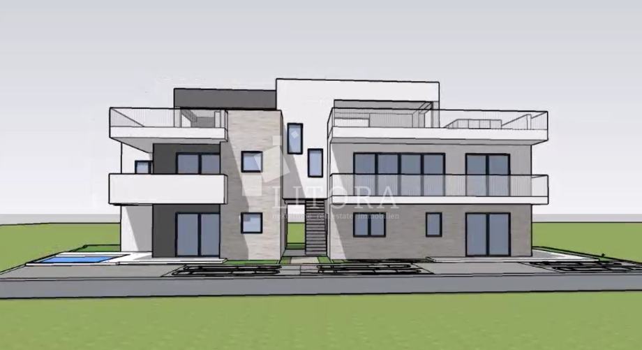 Vodice – Novogradnja, Dvoetažni trosobni apartman površine 143,63 m² s velikom krovnom terasom i bazenom. Smješten je na prvom katu novoizgrađene stambene zgrade, s pripadajućom krovnom terasom. Zgrada se nalazi na mirnoj i pristupačnoj lokaciji, udaljena 950 m od plaže i 1.700 m od centra Vodica, s lako dostupnim svim sadržajima potrebnim za ugodan boravak i život.
