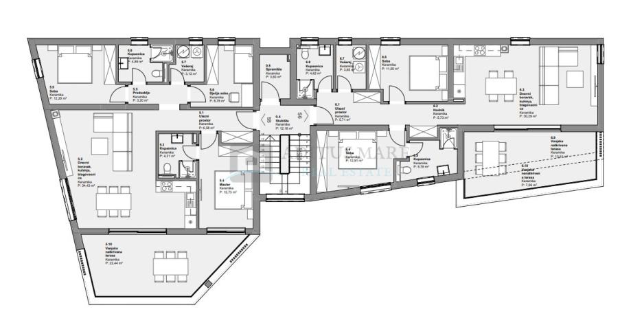 Stan S6 raspolaže netto korisnom površinom 88.84m2 te se sastoji od: ulazni prostor, kupaonica, vešeraj, hodnik, spavaća soba 1, spavaća soba 2 s kupaonicom, kuhinja i blagovaonica, dnevni boravak, natkrivena i nenatkrivena terasa sa pogledom na more.