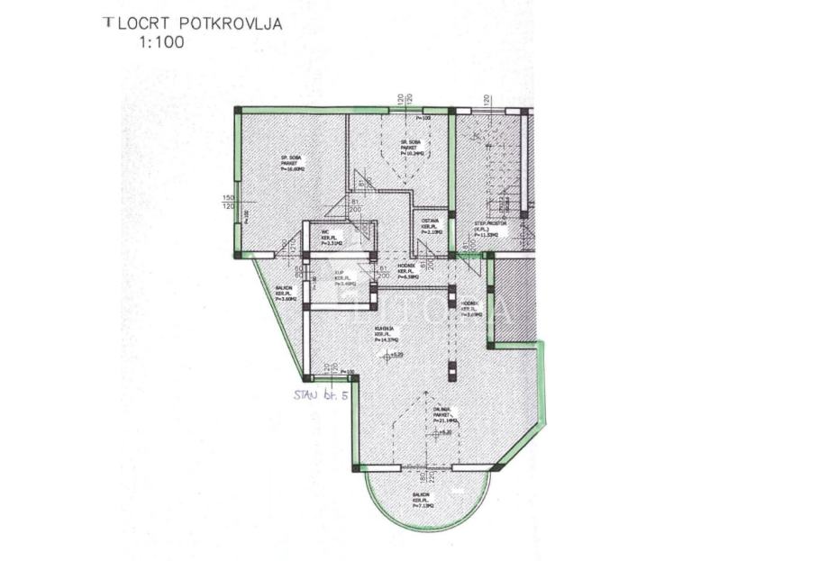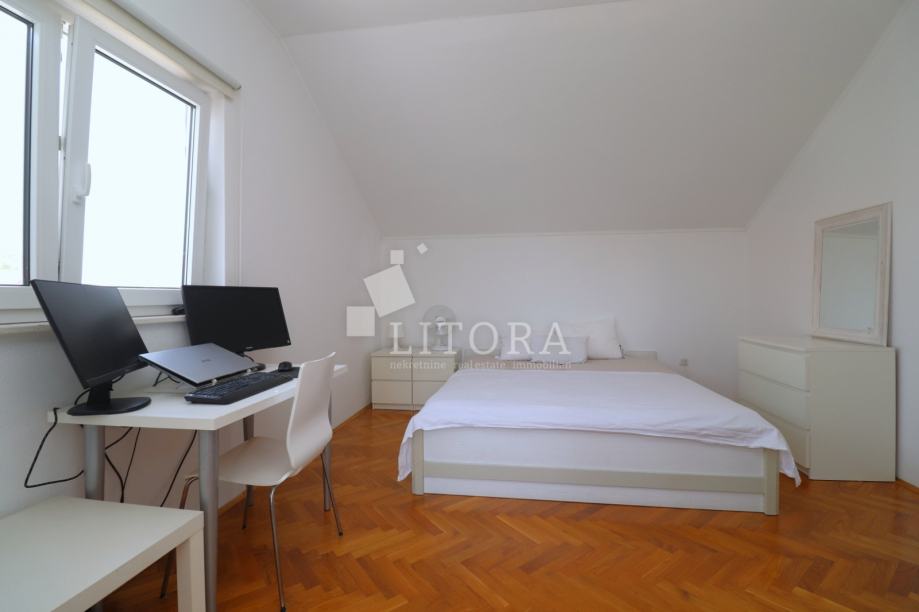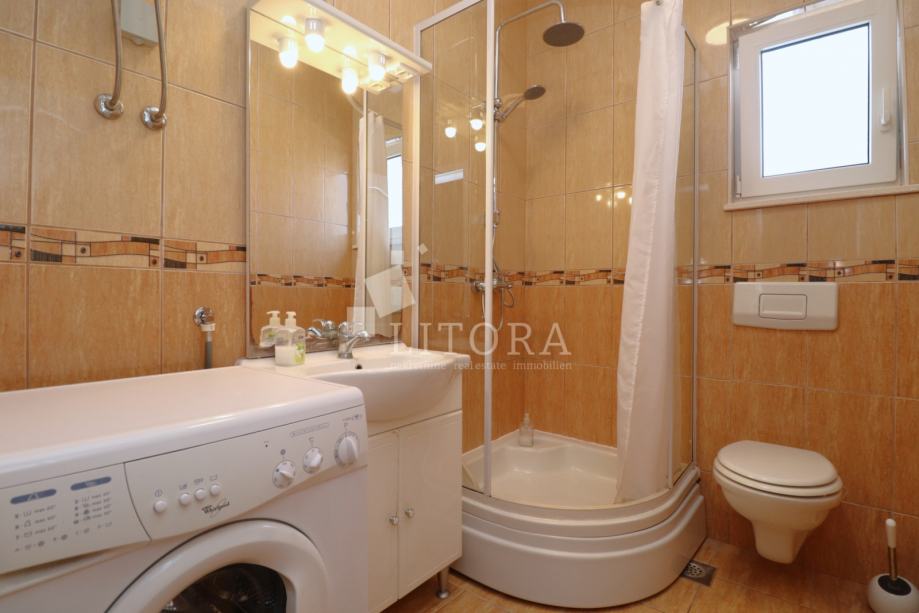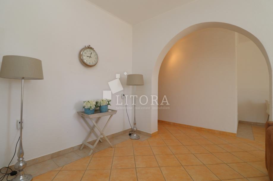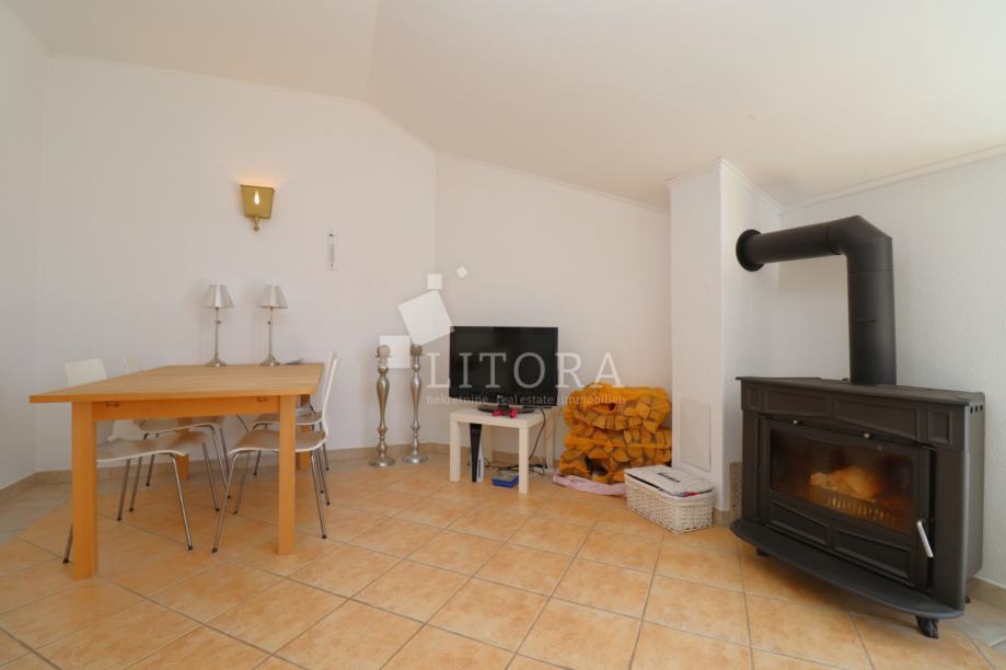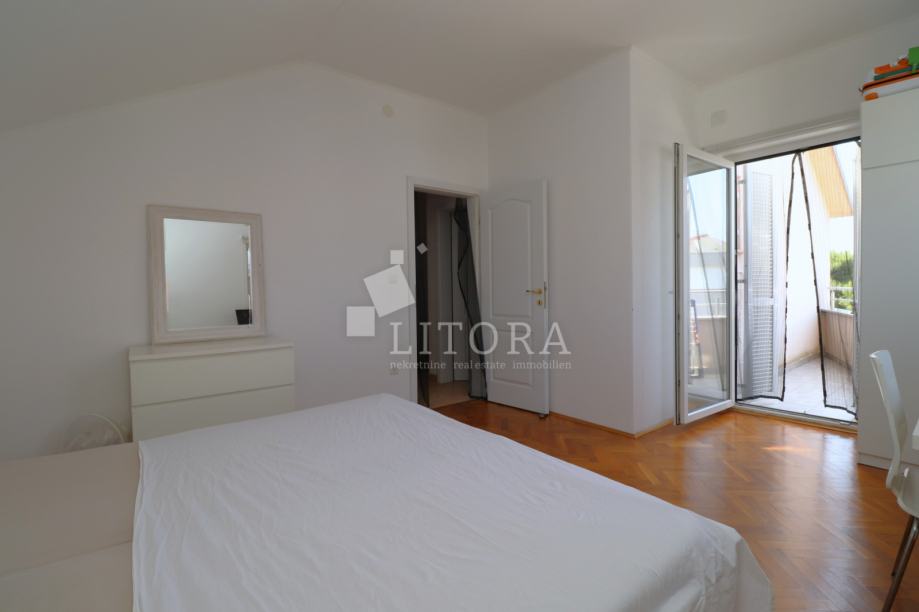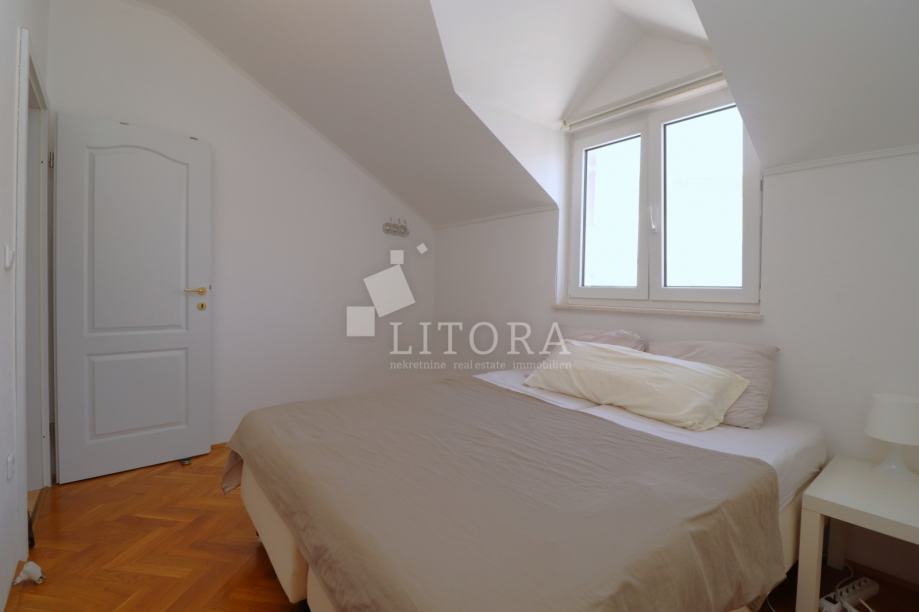 U potpunosti namješten, komforan stan smješ-ten na drugom katu / potkrovlju stambene zgrade, nalazi se svega 430 metara od plaže. Stan je južno orijentiran i ima 87,66 m² korisne površine. Sastoji se od hodnika, ostave, kupa-onice, zasebnog WC-a, dvije spavaće sobe (od kojih jedna ima vlastiti balkon) te prostranog dnevnog boravka s kuhinjom i blagovaonicom koji ima izlaz na veliku terasu.
