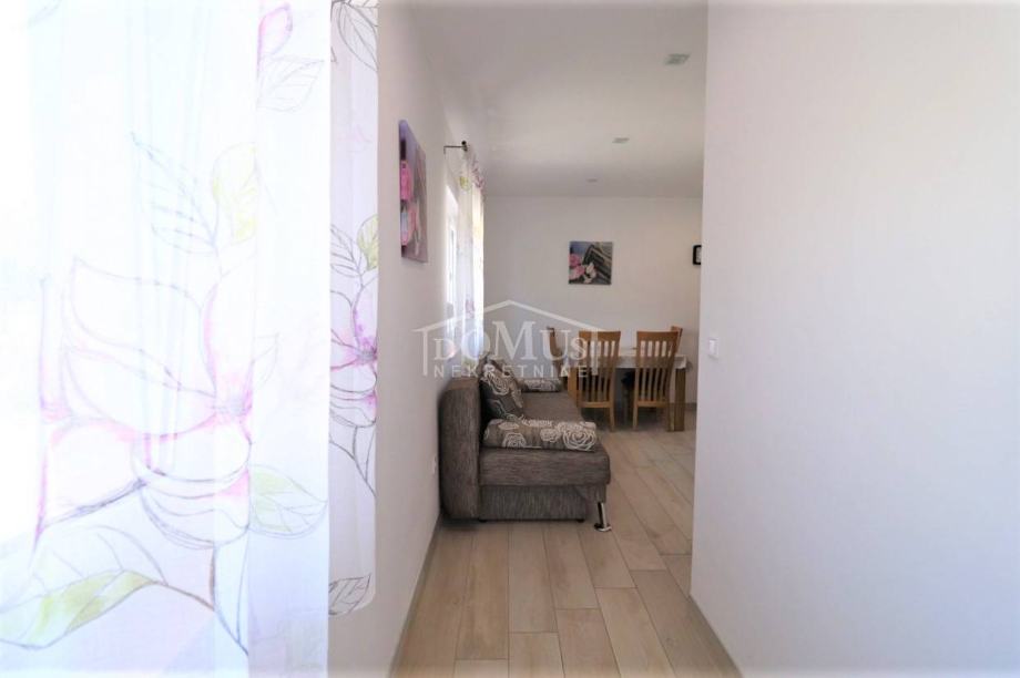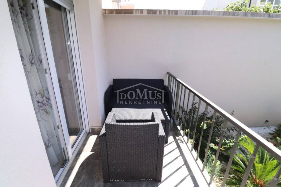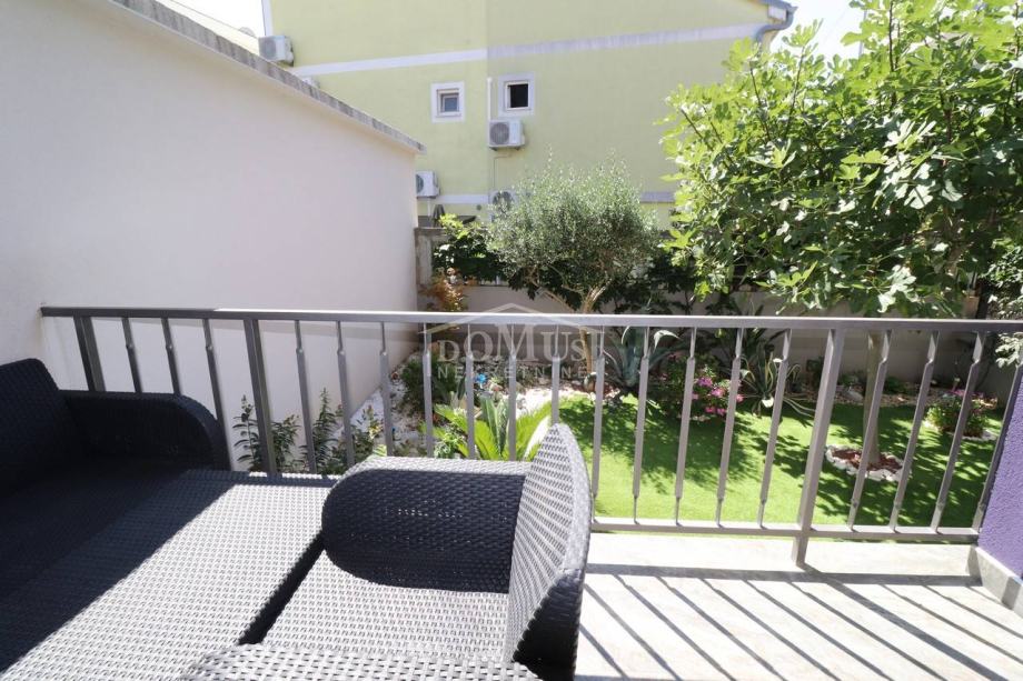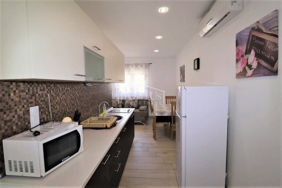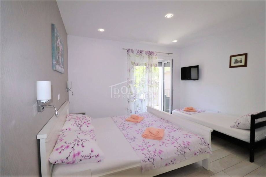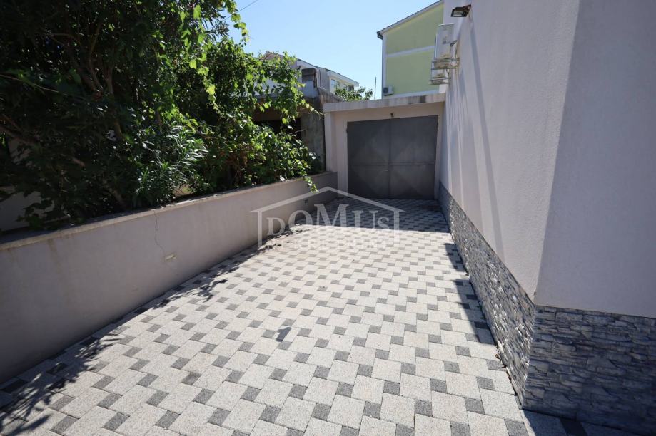 Atraktivna lokacija, udaljenost 230m od plaže Lovetovo. Studio apartman u prizemlju, južna strana, ukupne korisne površine 36,50 m2, a koji se sastoji se od kuhinje s blagovaonom i dnevnim boravkom te spavaćeg dijela u cjelini ( uz manje preinake je moguće u potpunosti odvojiti spavaću sobu), kupaonice, terase 4,96m2, te vrta površine 15,66 m2, apartman je u potpunosti namješten, isti je uključen u cijenu nekretnine. Apartmanu pripada garaža površine 31,03 m2 koja nije uređena, ali sa izvedenim instalacijama struje i vode ( mogućnost preinake u stambeni prostor) te jedno parkirno mjesto ispred garaže. Apartman je udaljen 1500m od centra grada.