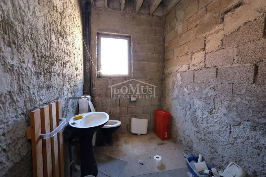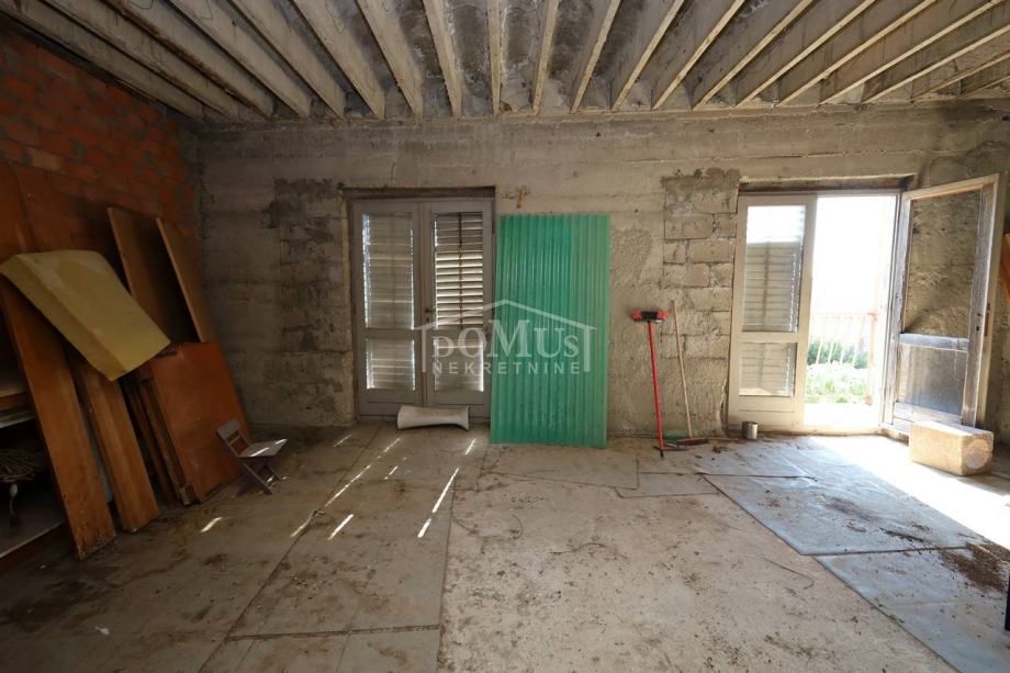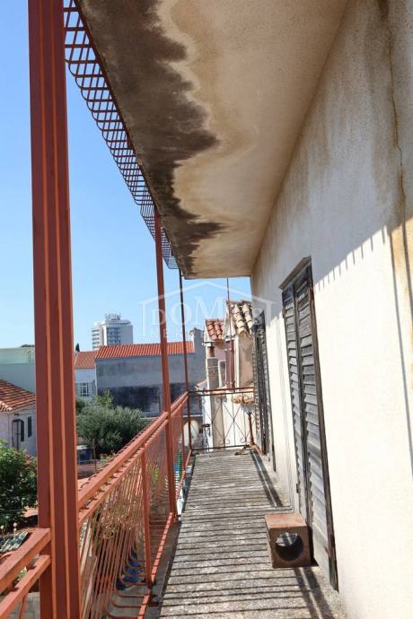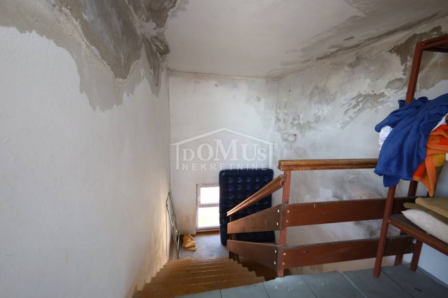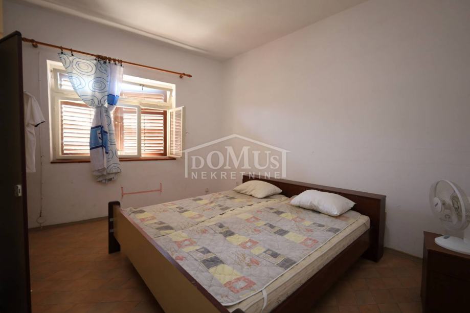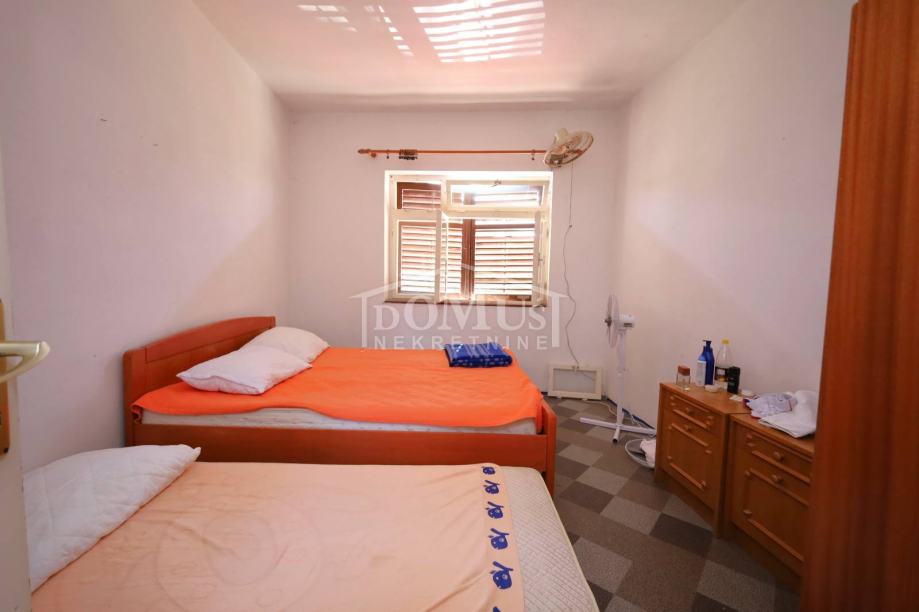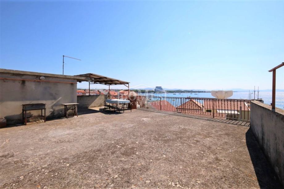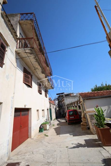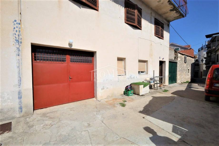 Vrhunska lokacija u centru Vodica, samo 300 m udaljeno od uređene plaže. Kuća u nizu koja ima 270 m2 korisne površine, podijeljena na tri etaže plus krovna terasa 90m2. U prizemlju se nalazi garaža od 28 m2 sa zasebnim ulazom. Stan u prizemlju se sastoji od hodnika, predsoblja, dnevni boravak, kuhinja i ostava, 1 spavaća soba, wc i kupaonica. Unutarnje stepenište vodi na 1.kat gdje se nalazi hodnik, 4 spavaće sobe, predsoblje, wc i kupaonica. Na 2. katu se nalazi hodnik, također 4 spavaće sobe, balkon, predsoblje, wc, kupaonica i unutarnje stepenište koje vodi na krovnu terasu. Jedan dio kuće je useljiv dok je drugi dio za kompletnu adaptaciju.