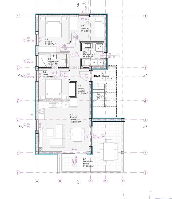 STAN S2 ima 89,42m2 korisne površine + 9,61m2 spremište, te se sastoji od: ulazni prostor, kupaonica 1, spavaća soba 1 s vlastitom kupaonicom, spavaća soba 2, spavaća soba 3, kuhinja i blagovaonica, dnevni boravak, natkrivena terasa 19,06m2, te parkirna mjesta P2 i P3.