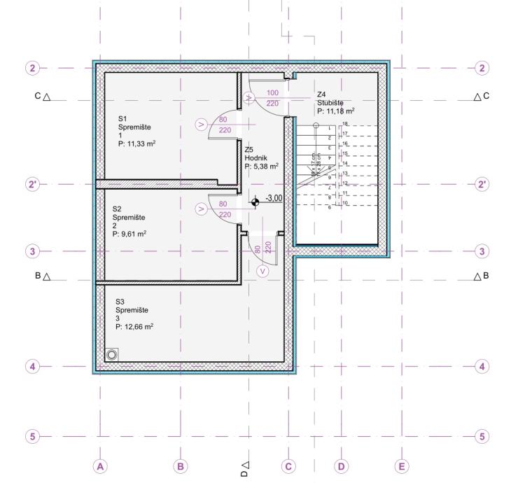 STAN S3 nalazi se na drugom katu, ima 89,42m2 korisne površine + 12,66m2 spremište, te se sastoji od: ulazni prostor, kupaonica 1, spavaća soba 1 s vlastitom kupaonicom, spavaća soba 2, spavaća soba 3, kuhinja i blagovaonica, dnevni boravak, natkrivena terasa 19,06m2, te parkirna mjesta P1 i P6.
