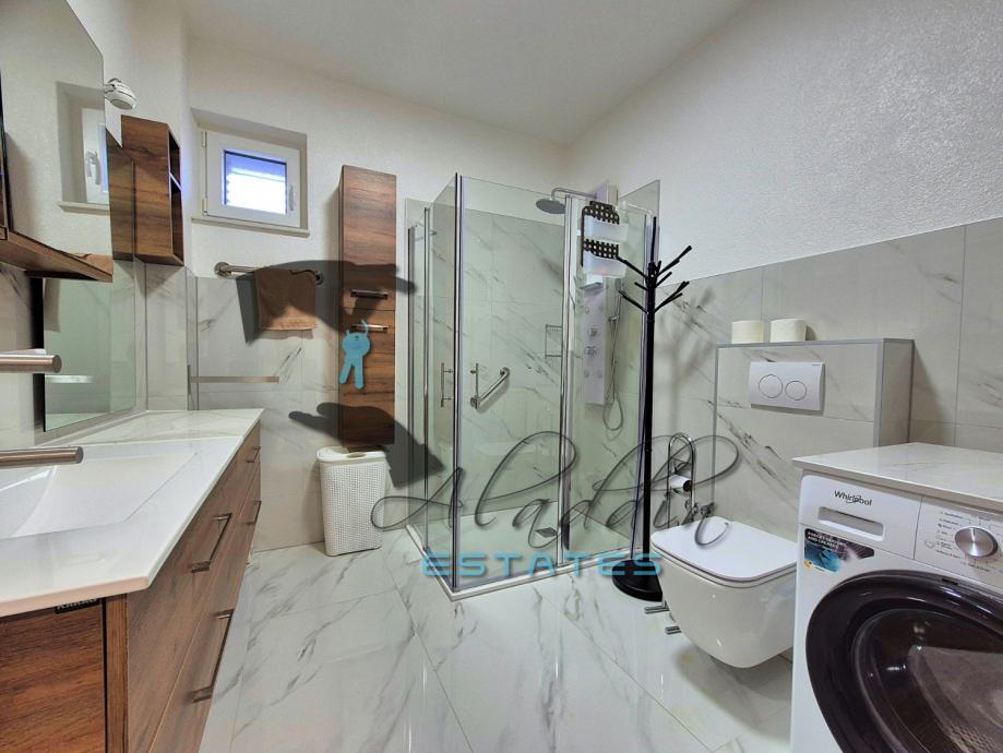 Postavljen je klima uređaj u svakoj sobi (tri u prizemlju i tri na katu), kao i priključci za satelitsku i zemaljsku televiziju, kuhinje po mjeri skupa s perilicom posuđa, moderne kupaonice, peć na pelete u prizemlju s vanjskim inox dimnjakom, prvoklasna PVC stolarija s dvoslojnim izo staklima, komarnici i aluminijske škure na svim prozorima i balkonskim vratima, elegantni laminati u spavaćim sobama i kvalitetne keramičke pločice u ostalim prostorijama, profinjeno stubište sa stiliziranom ogradom i rasvjetom, fasada od termo žbuke, odlična aluminijska kapija na daljinsko otvaranje sa zasebnom kapijom za pješake.