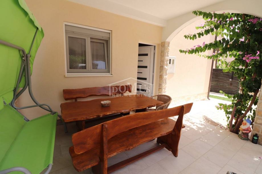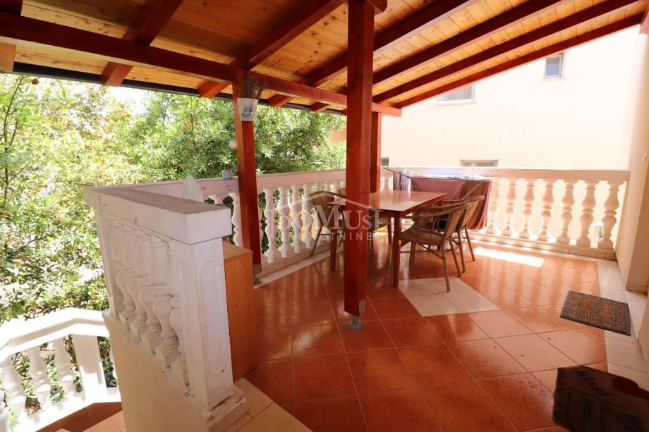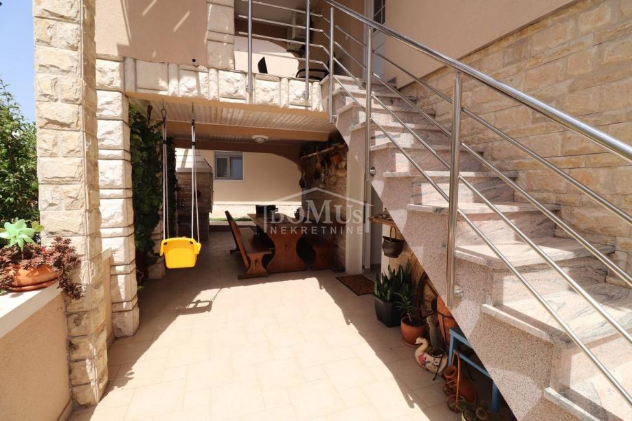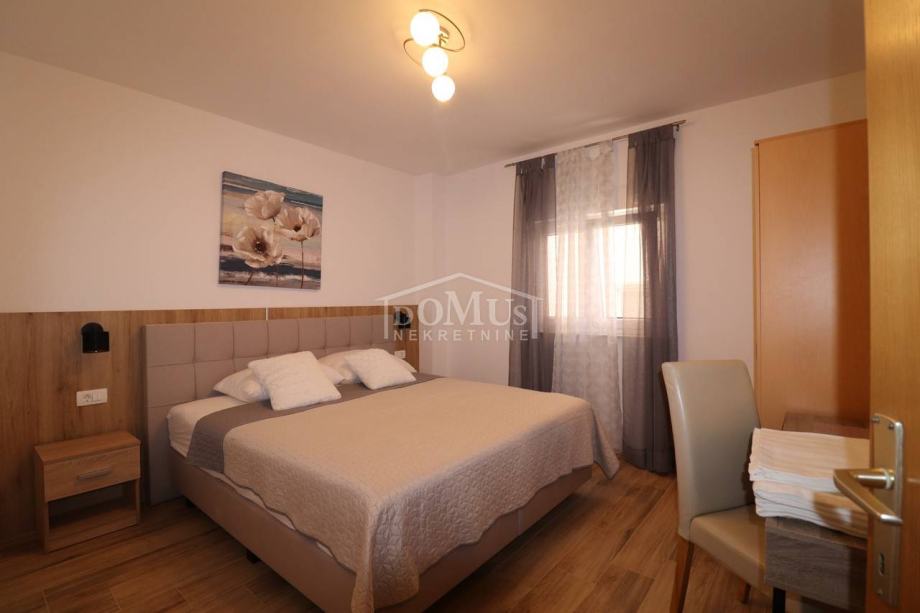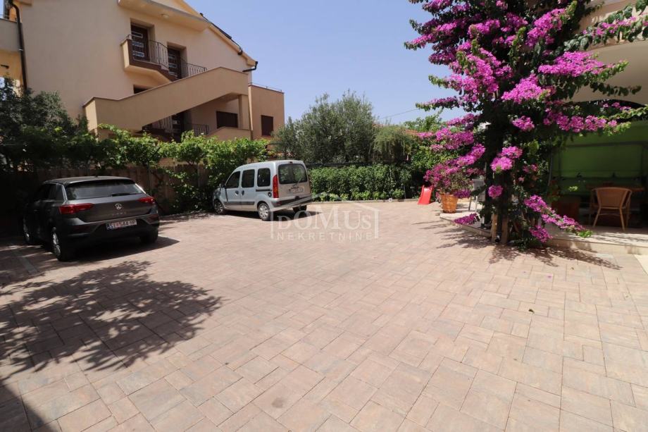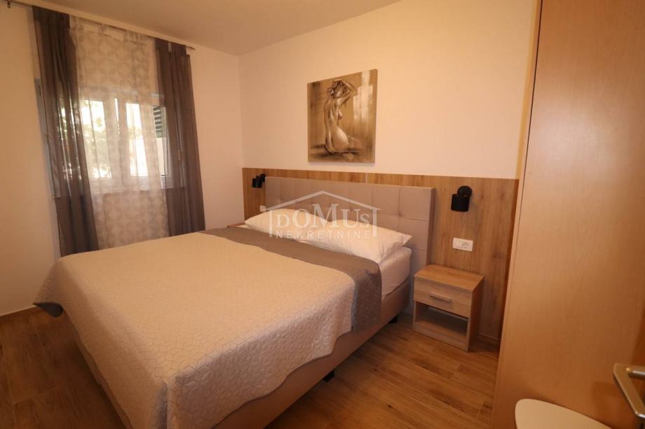 Dvije kompletno uređene apartmanske kuće na mirnoj lokaciji. Kuća 1 ima tri etaže sa ukupno 210,09m2 stambene površine na parceli površine 273m2. Sastoji se od garaže i dvosobnog apartmana u prizemlju, vanjsko stubište vodi na kat gdje se nalaze 2 dvosobna dvoetažna apartmana. Kuća 2 ima tri etaže sa ukupno 227,25m2 stambene površine na parceli 147m2. Sastoji se od dvosobnog apartmana i spremišta u prizemlju, 2 jednosobna apartmana na katu i komforan dvosobni apartman u potkrovlju sa pogledom na more. Apartmani su kompletno namješteni i namještaj je uključen u cijenu. Udaljenost od mora i Plave plaže je 600 m, a od centra 500m.