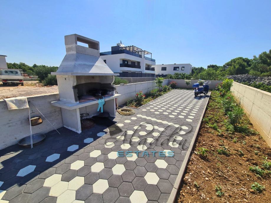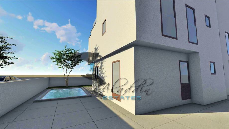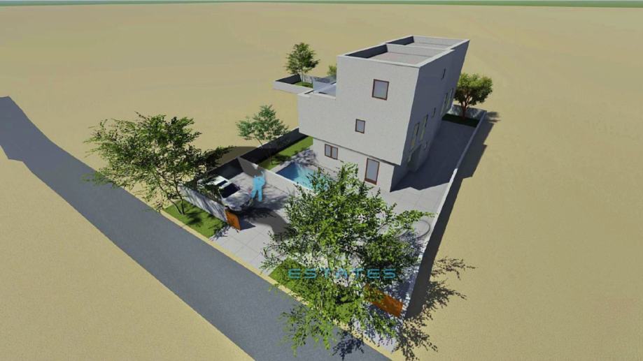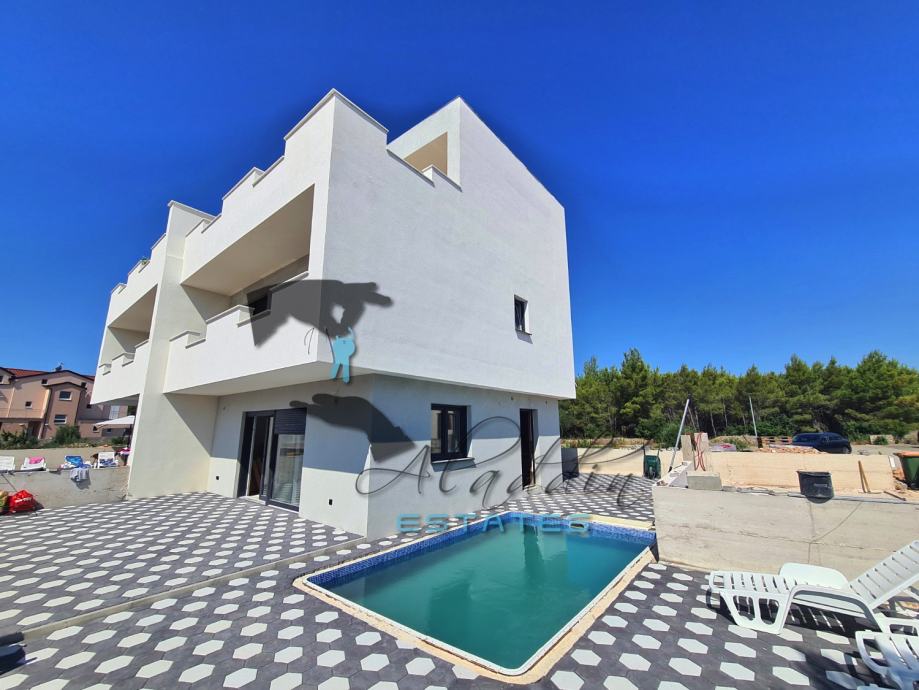 Two modern, luxuriously equipped and completely furnished semi-detached holiday homes under construction, in Srima near Vodice. They extend over three floors, with 319 square meters of gross living space, featuring nice view of the sea from the roof terrace. Each includes a modern swimming pool of 15 m2 with a sun deck, three parking spaces and a landscaped garden area.