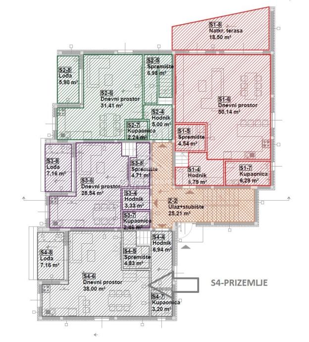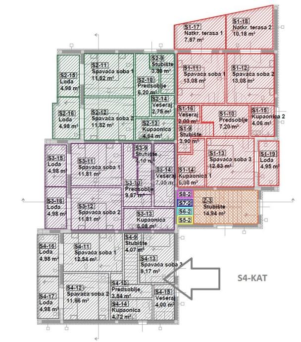 S4-trosoban, dvoetažni stan u prizemlju i na prvom katu stambene zgrade neto površine 125.82 m/2. Stan se sastoji od prizemlja s ulaznim pretprostorom, dnevnog boravka s pripadajućom kuhinjom i blagovaonicom, kupaonice i manjeg spremišta. Iz dnevnog boravka se izlazi na lođu površine 7.16 m/2. Unutarnje stepenice vode do prvog kata gdje su smještene tri spavaće sobe od kojih je jedna master spavaća soba s vlastitom kupaonicom, zajednička kupaonica i praonica. Svaka soba posjeduje i pripadajuću lođu. Stanu pripada i vrt u prizemlju površine 60.88 m/2 te dva parkirna mjesta.
