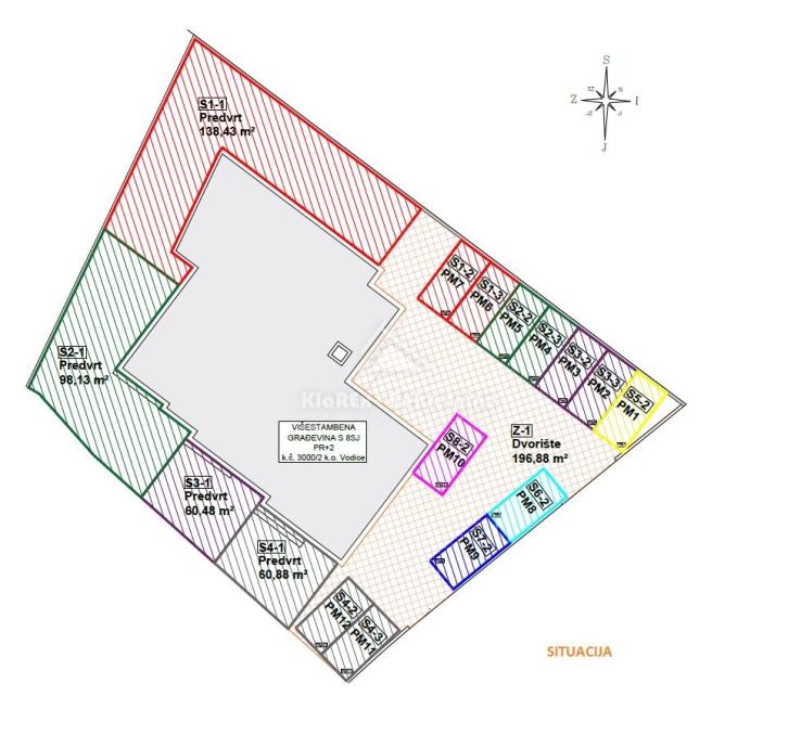U Vodicama, na izrazito mirnoj lokaciji udaljenoj oko 1200 metara od mora, odnosno centra grada se stavljaju u prodaju stanovi u novogradnji. Riječ je o stambenoj zgradi s ukupno osam stambenih jedinica od kojih su četiri stana dvoetažni stanovi s pretežno dvije spavaće sobe dok su ostala četiri stana pretežno jednosobni, klasični jednoetažni stanovi. Najmanji stan je jednosobni stan neto površine 48.66 m/2 dok je najveći stan dvoetažni, trosobni stan neto površine 172.73 m/2. Zgrada se gradi po modernim standardima gradnje koja uključuje PVC i ALU stolariju, podne obloge u kombinaciji keramike i laminata visoke klase, klima uređaje grijanje/hlađenje u svim prostorijama, podna grijanja u svim prostorijama osim spavaćih soba i dr. Svi dvoetažni stanovi posjeduju pripadajuća dvorišta s vrtovima i po dva parkirna mjesta dok jednoetažni stanovi drugog kata zgrade posjeduju po jedno parkirno mjesto. Zgrada je trenutno u završnoj fazi izgradnje dok se dovršetak projekta i useljenje očekuju do sredine srpnja 2025. Dinamika plaćanja u dogovoru s investitorom. U ponudi je:
