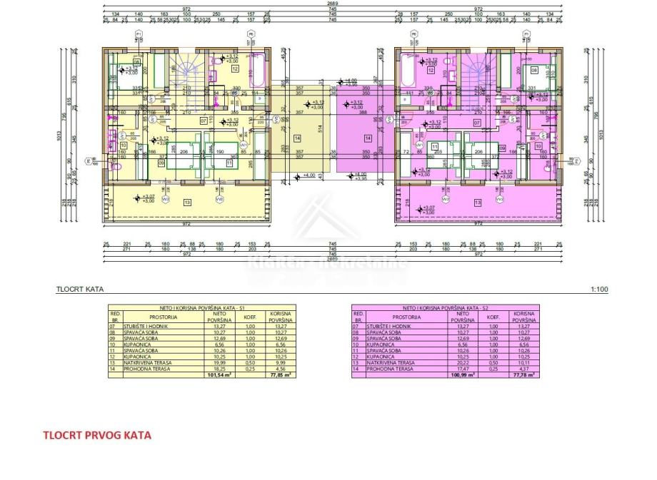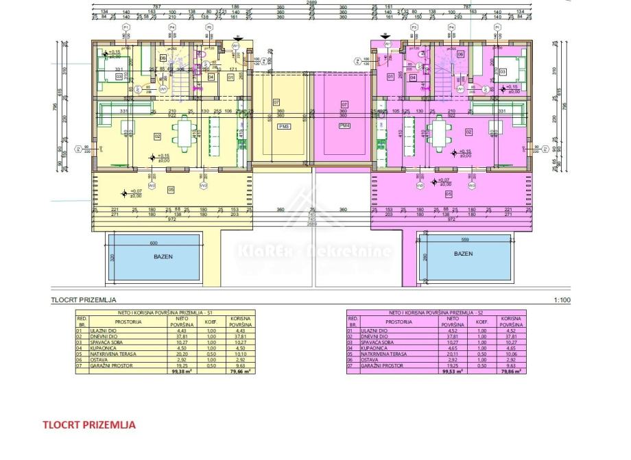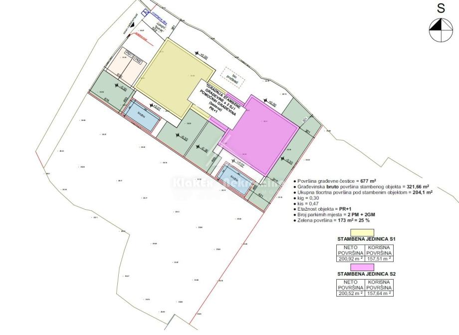 Stambena jedinica S1- dvoetažna dvojna kuća neto površine 157.51 m/2. Sastoji se od prizemlja i kata, ukupno četiri spavaće sobe od kojih je jedna master spavaća soba s vlastitom kupaonicom. Kuća posjeduje vanjski bazen površine 18 m/2, garažu, dva parkirna mjesta i okućnicu površine 200 m/2.