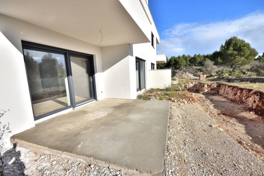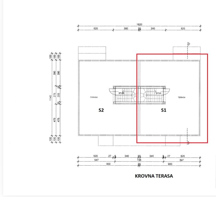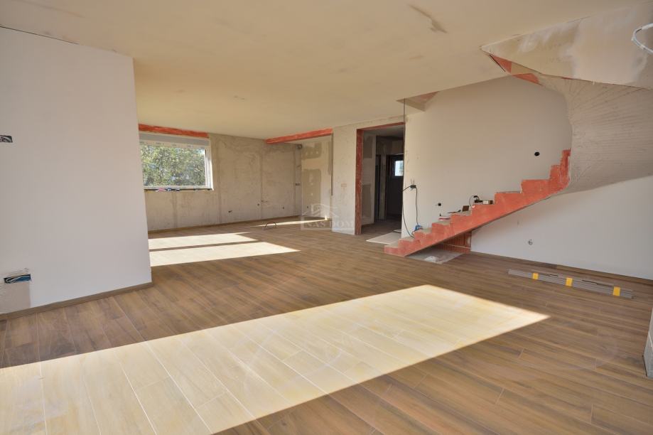 Vodice- prodaje se dvojna kuća s bazenom i krovnom terasom, 550 m od plaže. Kuća katnica moderne arhitekture ukupne neto površine 204,40 m2 ima tri etaže: prizemlje+kat+ 2 kat. Prizemlje se sastoji od: garaža površine 22,40 m2, natkriveni ulaz, hodnik, tehnička soba, wc, kuhinja s blagovaonicom i dnevni boravak open space rasporeda s izlazom na natkrivenu terasu površine 14,35m2. Unutarnjim stubištem se ide na prvu etažu kuće gdje se nalazi hodnik, dvije spavaće sobe s izlazima na zajednički natkriveni balkon površine 10,30m2, zajednička kupaonica te master spavaća soba s garderobom i vlastitom kupaonicom i izlazom na natkrivenu terasu površine 5,55m2. Unutarnjim stubištem se ide na zadnju etažu kuće koja se sastoji od krovne terase površine 92,15m2. Kući pripada okućnica površine 280m2, koja se sastoji od bazena dimenzija 3,50 m * 6.50 m, vrta koji će biti kultiviran mediteranskim biljem i popločanog parkirnog prostora.
