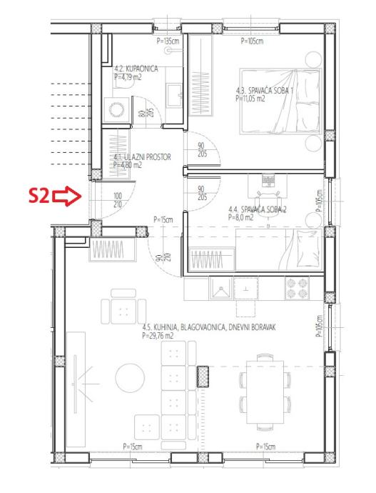 STAN S2 ima 70m2 neto korisne površine s uračunatim koeficijentima, te se sastoji od: ulaz, 2 spavaće soba, kupaonica, kuhinja i blagovaonica, dnevni boravak, terasa, vrt cca. 92m2, te 1 parkirno mjesto.