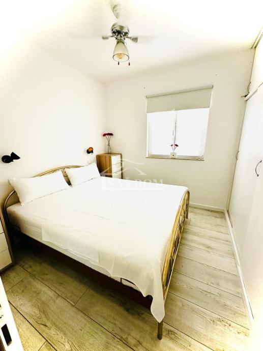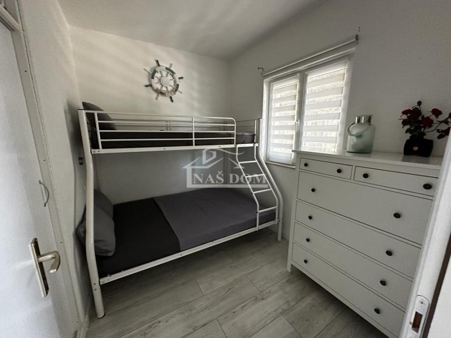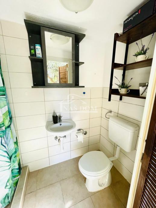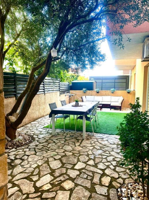 Vodice, SRIMA - prodaje se namješteni stan s vrtom na mirnoj lokaciji. Stan se nalazi u prizemlju zgrade i ima ukupnu površinu neto korisne vrijednosti 56,70m2 te se sastoji od stana stambene površine 42,59m2 i sadrži dvije spavaće sobe, kupaonicu kuhinju s blagovaonicom i dnevni boravak i terasa površine 7,85m2. Stanu pripada i vrt površine 70,64m2 i jedno parkirno mjesto. Stran je kompletno namješten, opremljen je novom kuhinjom i klimatiziran. Vrt je uređen i u njemu se nalazi ljetna kuhinja, kupaonica i roštilj.