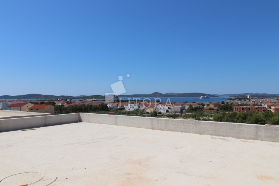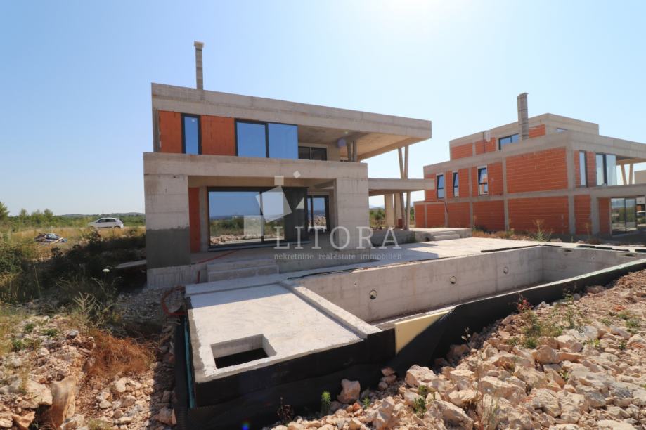Vodice - ekskluzivna vila sa panoramskim pogledom na more. Udaljena od gradske gužve, nudi mir i potpunu privatnost, stvarajući savršen ambijent za opuštanje i uživanje. Sa svojom elegantnom troetažnom strukturom vila predstavlja savršen spoj luksuza i funkcionalnosti. Ukupno 489 m² korisne površine, od čega 277,54 m² zatvorene stambene površine, pruža budućim vlasnicima obilje prostora i privatnosti. Prostrani vanjski dio s bazenom od gotovo 39 m² okruženim sunčalištem idealan je za druženja i opuštanje. Interijer odiše komforom i stilom – od ulaznog prostora, preko vešeraja, garaže, gostinjskog WC-a, spavaće sobe sa vlastitom kupaonicom do modernog open space koncepta kuhinje, blagovaonice i dnevnog boravka s izlazom na prostranu natkrivenu terasu i vrt s panoramskim pogledom.