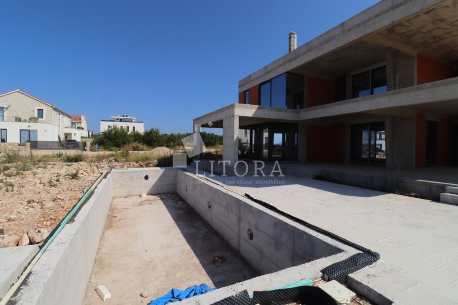Na prvom katu se nalaze tri luksuzne spavaće sobe s vlastitim kupaonicama te fitness soba sa saunom i tušem pružaju vrhunski životni ugođaj, dok velika terasa pruža predivan pogled na more. Na posljednjoj etaži, terasa je opremljena svim priključcima za struju i vodu, te predstavlja idealnu oazu za sunčanje i relaksaciju s mogućnošću postavljanja jacuzzija. Kuća se prodaje u roh bau fazi sa izvedenom instalacijom struje, postavljenom stolarijom. Mogućnost kupnje i kompletno dovršenog objekta.