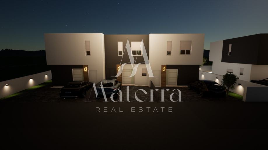 U prizemlju se nalazi prostrani otvoreni prostor kuhinje, blagovaonice i dnevnog boravka, hodnik, WC i natkrivena terasa s vrtom i bazenom.