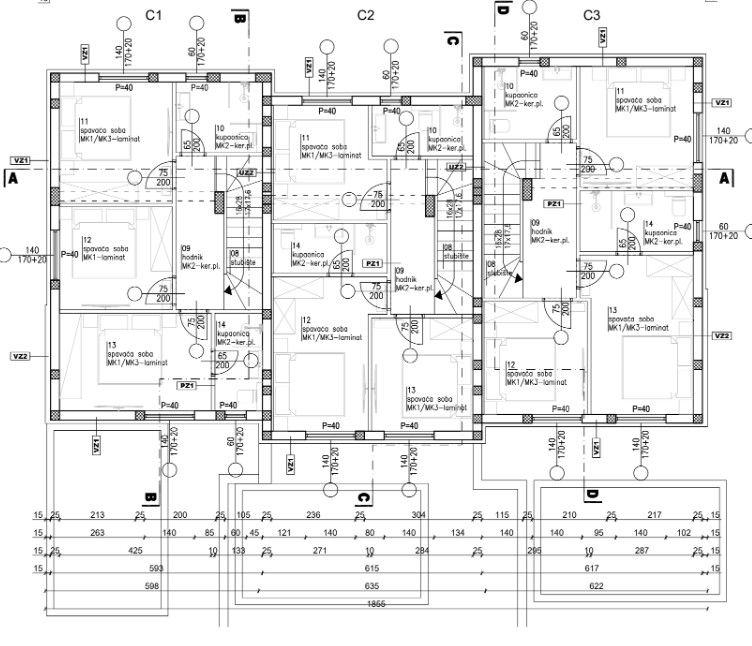 Na prvom katu su hodnik i tri spavaće sobe, uključujući glavnu spavaću sobu s privatnom kupaonicom, te jedna zajednička kupaonica (obe kupaonice imaju podno grijanje).