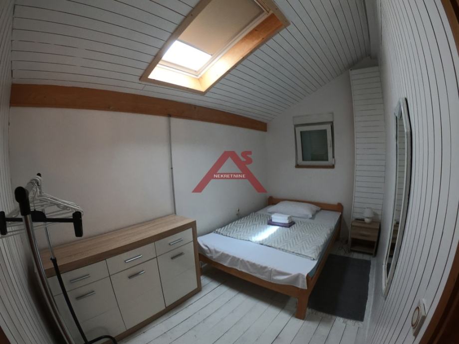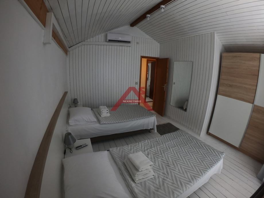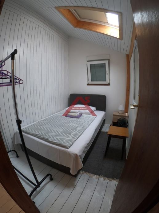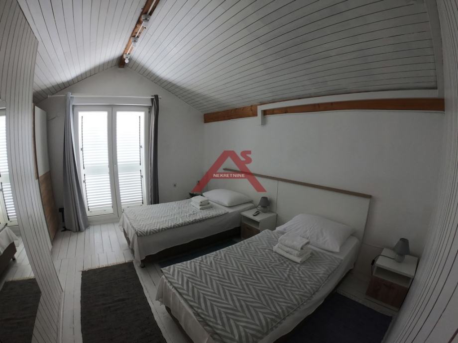 Druga etaža je na katu, a sastoji se kuhinje, blagovaonice i velikog dnevnog boravka, toaleta sa wc-eo te ostave. Na trećoj etaži se nalaze 3 spavaće sobe sa velikom terasom i pogledom na more, otoke i na šetnicu. Kuća se može pretvoriti u 3 odvojene stambene jedinice. Kuća se koristi za turizam i donosi lijepi godišnji prihod. Vlasništvo je uredno i bez tereta. CIJENA JE SNIŽENA. Vrijedna je pažnje u svakom pogledu. Za dogovor o razgledavanju nazovite 0989137596.