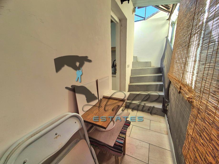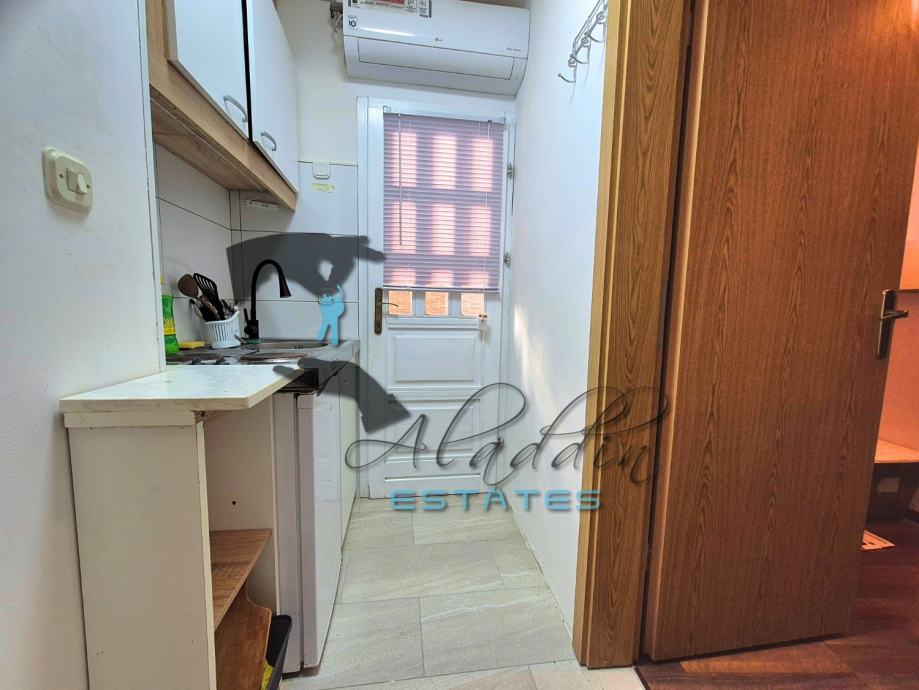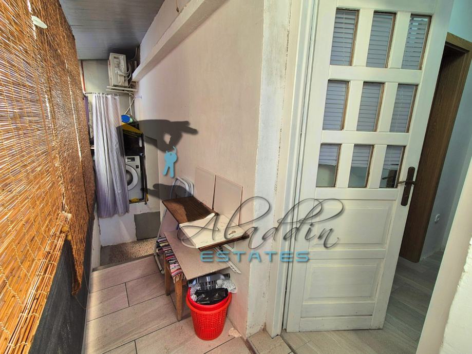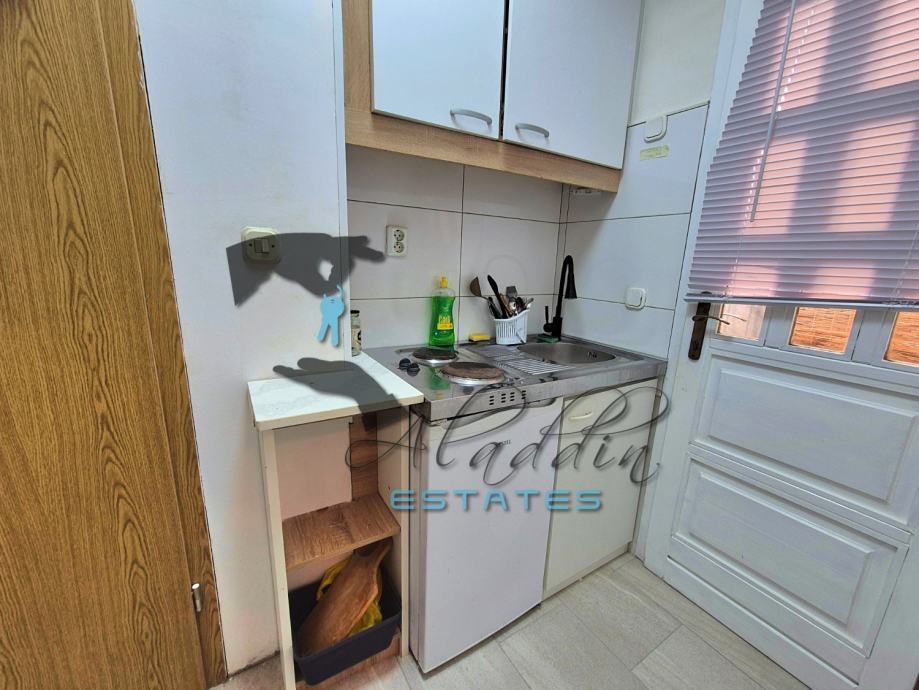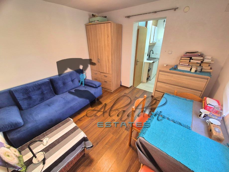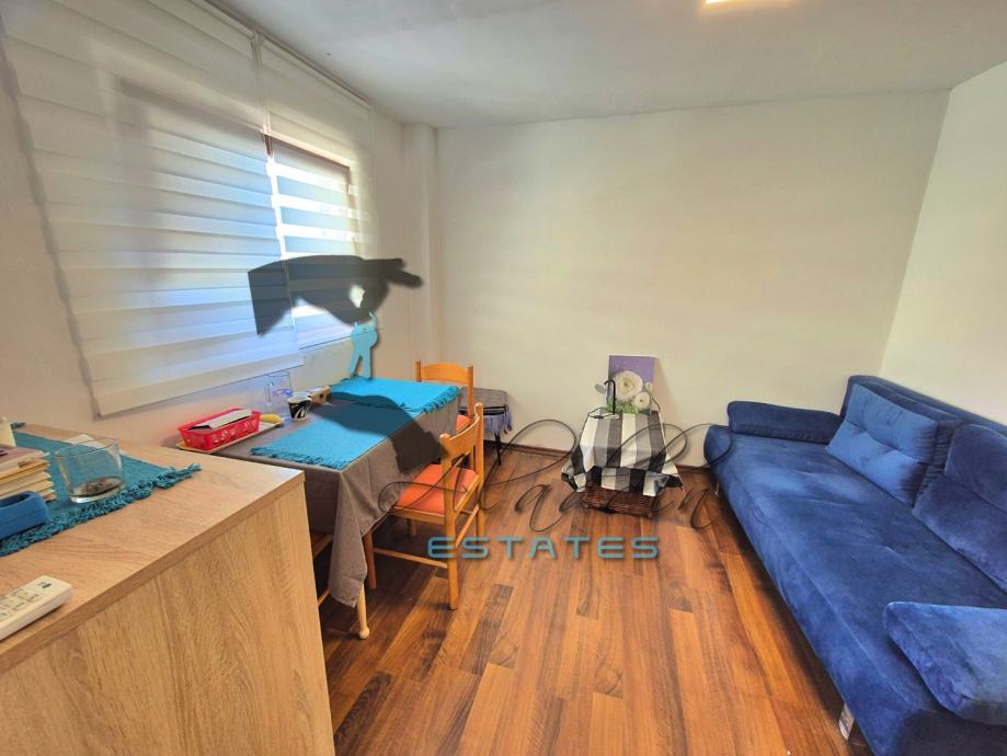 Elegant ceramic tiles are installed in the kitchen and bathroom, while the living room and bedroom have laminate flooring. The exterior carpentry is wooden with double-layered insulated glass, curtains, mosquito nets with shutters on both windows, and there is TV connection with a terrestrial antenna. The apartment possesses separate electricity and water meters and is connected to the sewage system.
