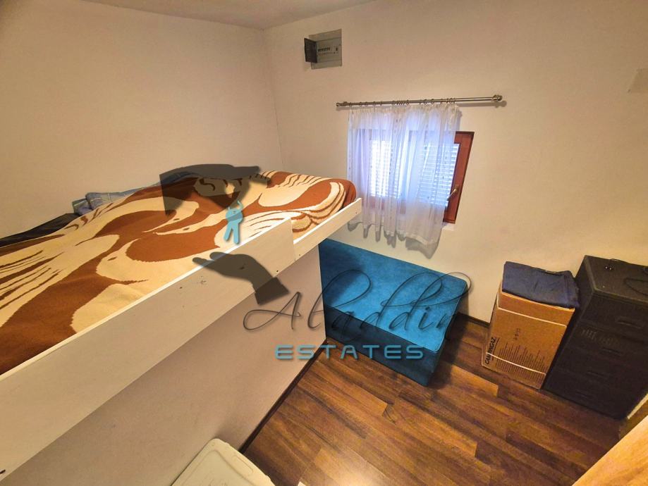 Jednosobni stan na drugom katu obiteljske kuće u Vodicama kraj Šibenika. U dobrom je stanju, održavan, potpuno opremljen i namješten. Sadrži dnevni boravak kombiniran s kuhinjom, jednu spavaću sobu, kupaonicu te hodnik. S vanjske se strane nalazi prilazno stubište koje pripada stanu, lođa od 5.55 m2 te vrlo primamljiva krovna terasa od punih 26.77 m2 s prekrasnim pogledom na more. Svekupno stan sadrži 34.04 m2 neto stambene površine s koeficijentima. Prošle je godine potpuno renovirana kupaonica i postavljeni novi tuš, WC školjka, bojler i pločice. Posjeduje inverter klima uređaj, kuhala na struju, hladnjak, perilicu rublja te bojler, i sve je funkcionalno.