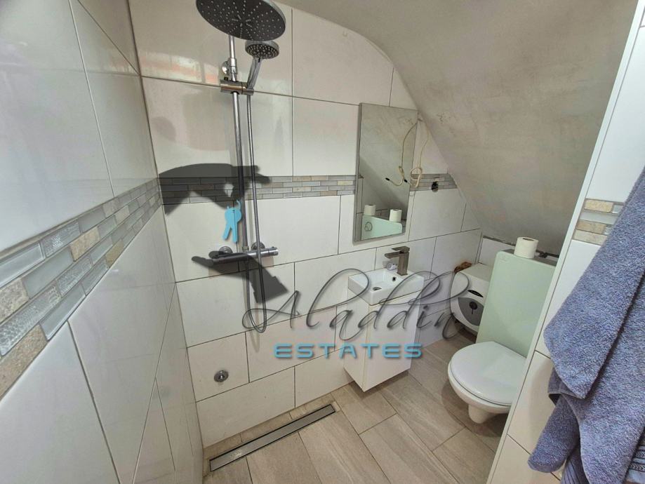 Single-bedroom apartment on the second floor of a family house in Vodice near Šibenik. It is in good condition, well-maintained, fully equipped and furnished. It contains living room combined with kitchen, one bedroom, bathroom and hallway. On the outside there is an access staircase that belongs to the apartment, loggia of 5.55 m2 and a very inviting roof terrace of a full 26.77 m2 featuring beautiful sea view. In total, the apartment comprises 34.04 m2 of net living space with coefficients. Last year, the bathroom was completely renovated and a new shower, toilet, water heater and tiles were installed. It has an inverter air conditioning unit, electric stove, refrigerator, washing machine and water heater, and everything is functional.