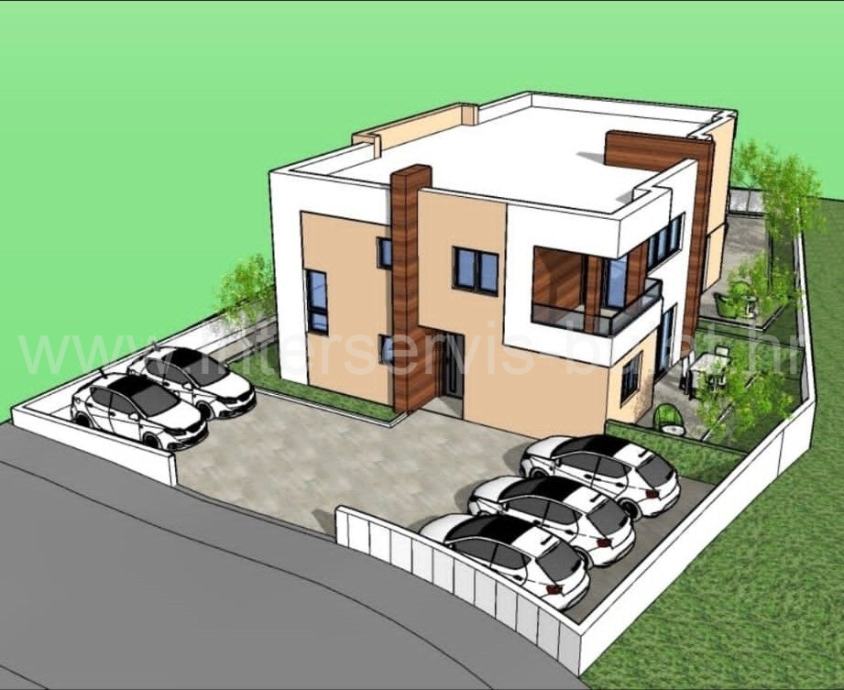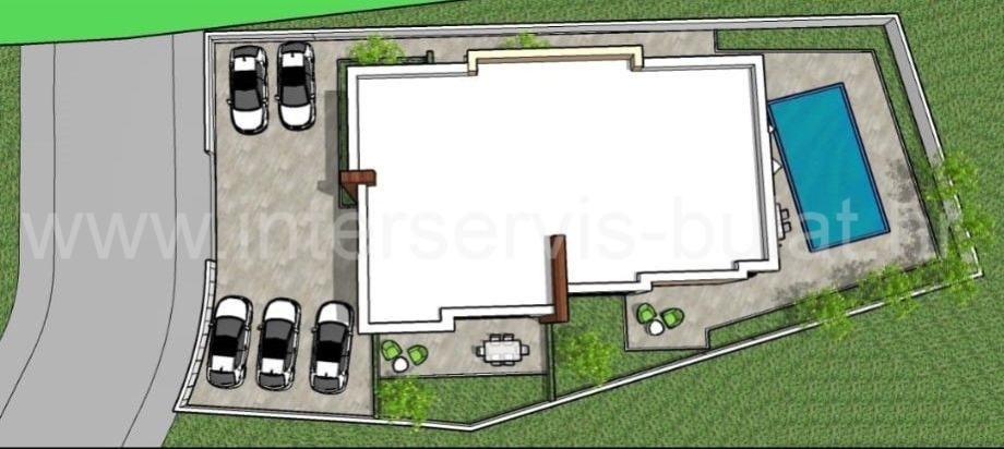 Kuća posjeduje dvorište površine 188m2 u kojem će biti smješten bazen 21m2, vrt i parkirni prostor.
