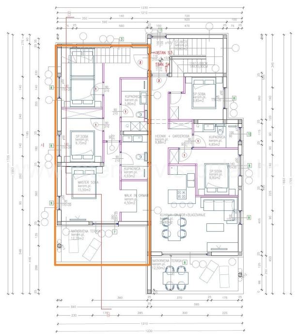 Stan S3 nudi 110,31m2 stambene površine. Donja etaža stana sastoji se od ulaznog prostora s garderobom, otvorene kuhinje s blagovaonicom i dnevne sobe, dvije spavaće sobe te kupaonice. Dnevni boravak ima pristup na komfornu natkrivenu terasu od 12,70m2. Unutarnje stepenice vode do gornje etaže gdje se nalaze ljetna kuhinja, WC i prostrana, djelomično natkrivena terasa od 61m2 koja osigurava predivan pogled na grad i more.