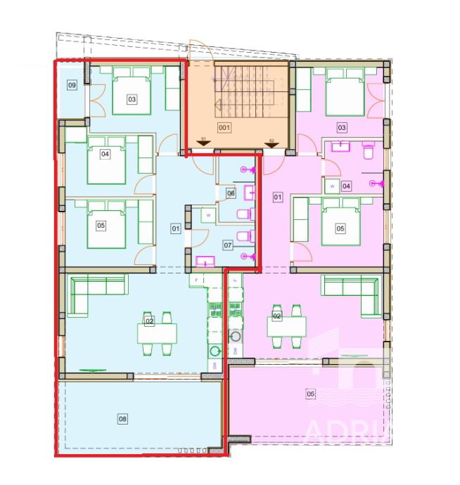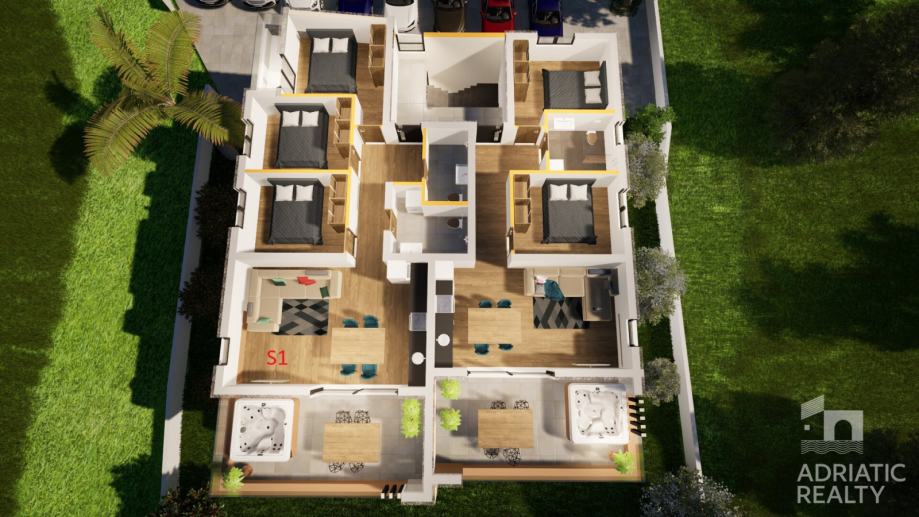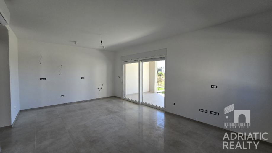 Apartman se sastoji od ulaznog prostora, kuhinje, blagovaonice i dnevnog boravka otvorenog koncepta, tri spavaće sobe, od kojih jedna ima vlastitu terasu, te dvije moderne kupaonice. Iz dnevnog boravka se izlazi na natkrivenu terasu koja se spaja s vrtom, pružajući dodatni prostor za boravak na svježem zraku. Apartmanu pripada i jedno parkirno mjesto.