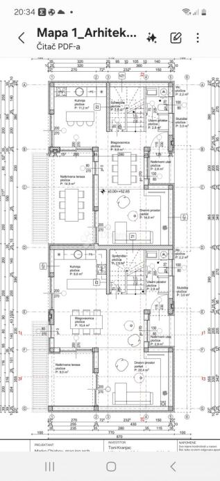 Kuća se sastoji od prizemlja, 1. kata i 2. kata. U okućnici prizemlja se nalaze 2 vanjska parkirna mjesta, dvorište/vrt i prekrasna, velika terasa s bazenom od 30 m2.