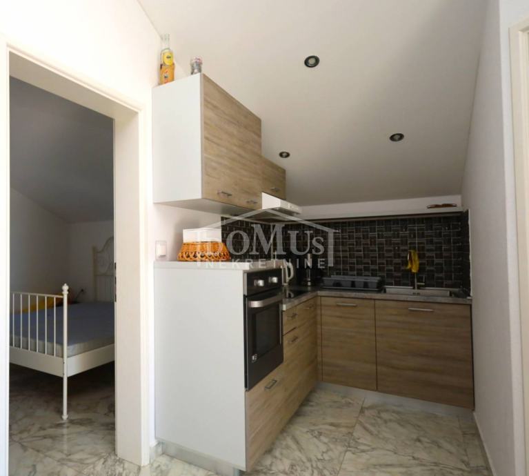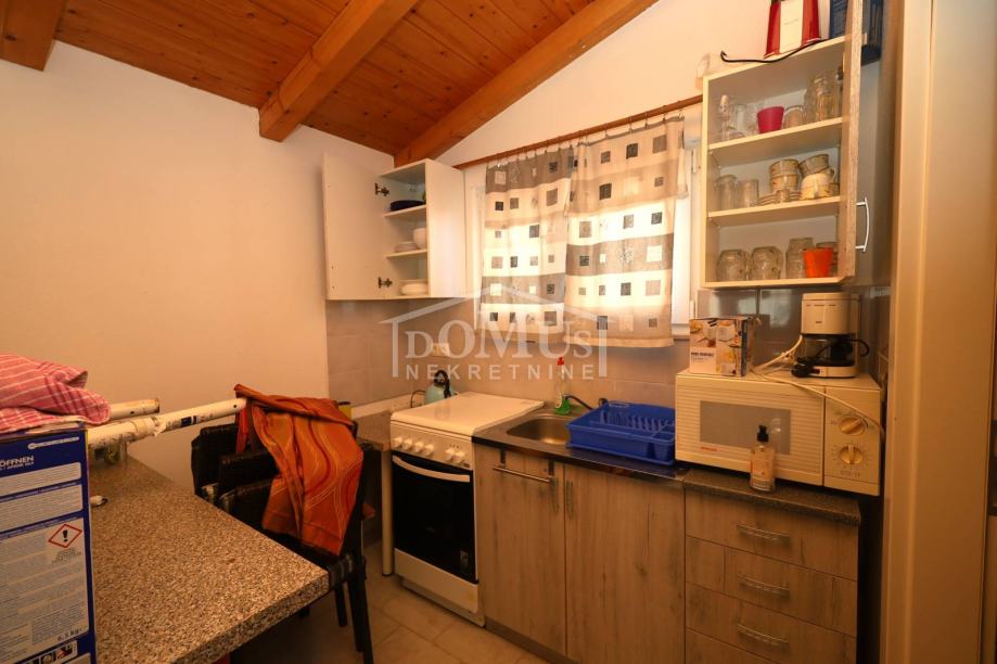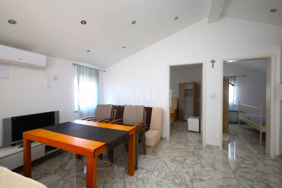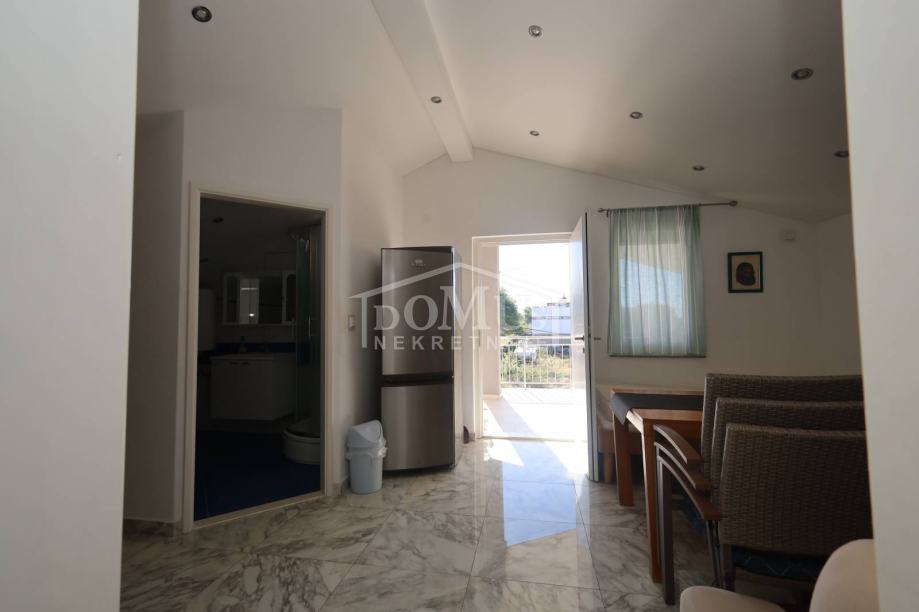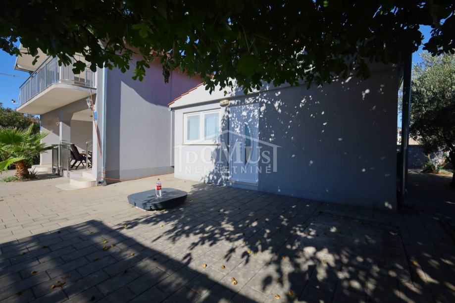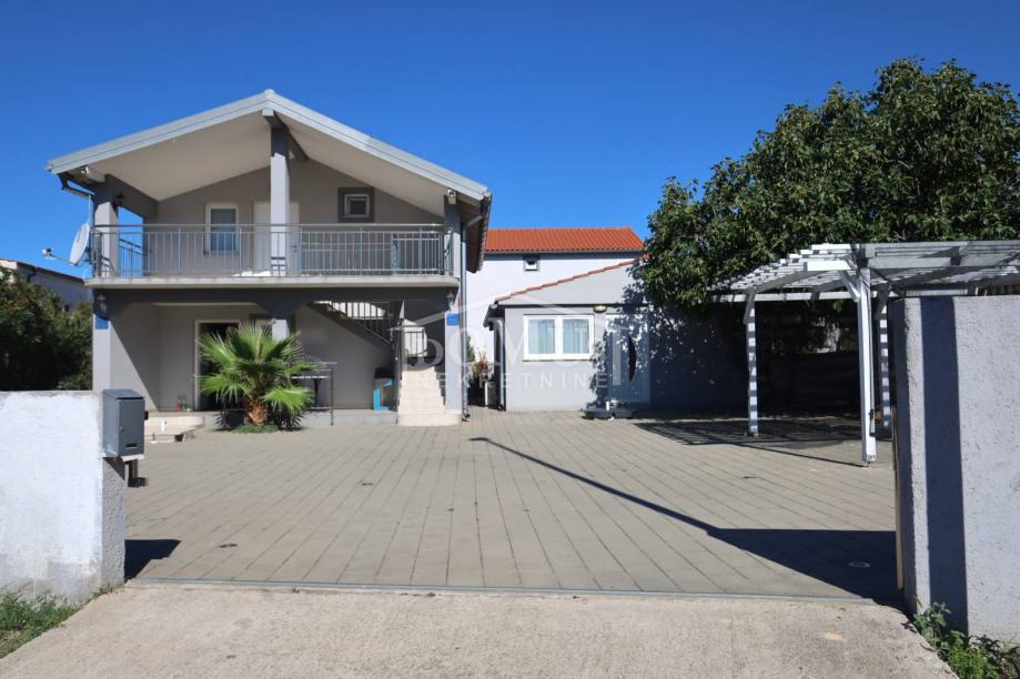 Samostojeća katnica sa ukupno 130 m2 sa korisne površine sa pomoćnim objektom na parceli od 502m2 u mirnom okruženju. Prizemlje kuće se sastoji od kuhinje sa blagovaonom, dvije spavaće sobe, toalet, kupaonica i natkrivena terasa. Vanjsko stepenište vodi na 1.kat gdje se nalazi stan sa dvije spavaće sobe, kupaonicom, dnevni boravak i kuhinja, te natkrivena terasa. Uz kuću se nalazi pomoćni objekt - dvorišna kućica koja je preuređena u jednosoban apartman, te vanjski roštilj. Kuća ima veliko dvorište koje može služiti kao parkirni prostor, mogućnost parkiranja do 6 auta. Kuća je kompletno uređena i useljiva, dvorište je popločano ispred kuće. Parcela je u potpunosti ograđena. Kuća je udaljena 1.600 m od uređene plaže, a 1.400 m od centra grada.