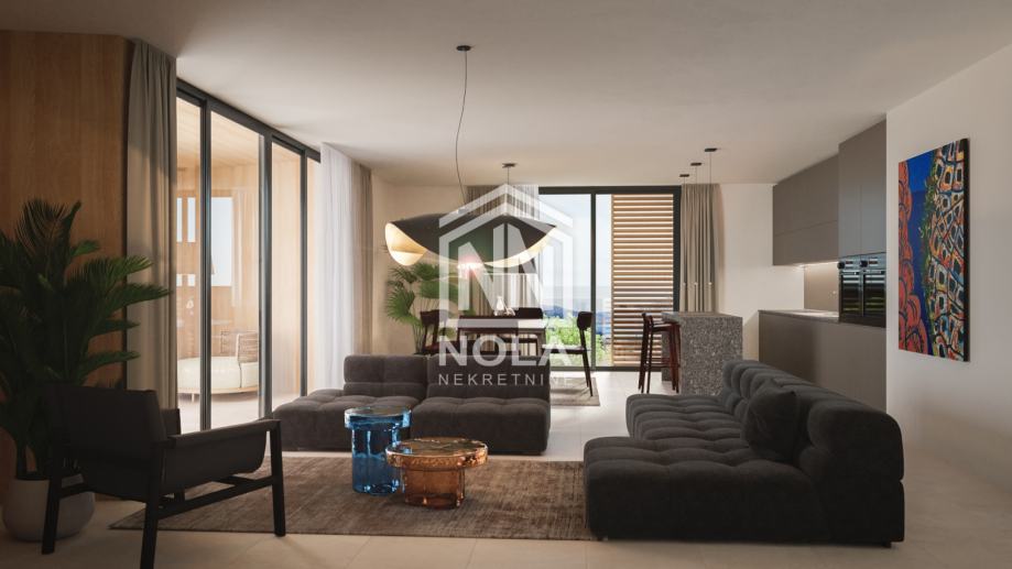 Dnevni boravak sa staklenim stijenama otvara se prema velikoj terasi i stvara osjećaj fluidnog, prozračnog životnog prostora. Interijer je osmišljen tako da osigura maksimalnu udobnost i sofisticiranost svakodnevice.